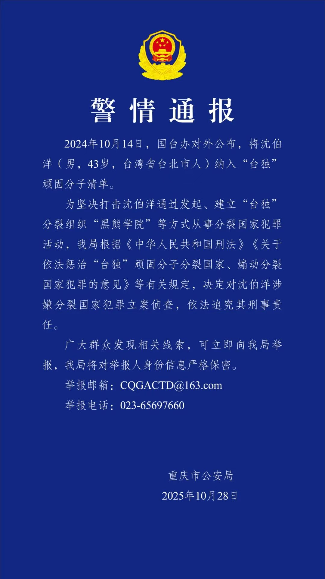 重庆市公安局28日发布警情通报表示,为坚决打击沈伯洋通过发起、建立“台独”分裂组织“黑熊学院”等方式从事分裂国家犯罪活动,该局根据《中华人民共和国刑法》《关于依法惩治“台独”顽固分子分裂国家、煽动分裂国家犯罪的意见》等有关规定,决定对沈伯洋涉嫌分裂国家犯罪立案侦查,依法追究其刑事责任。