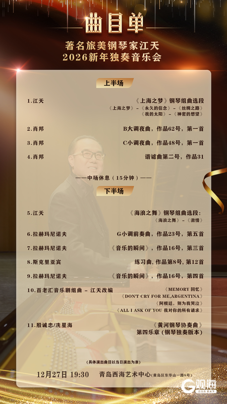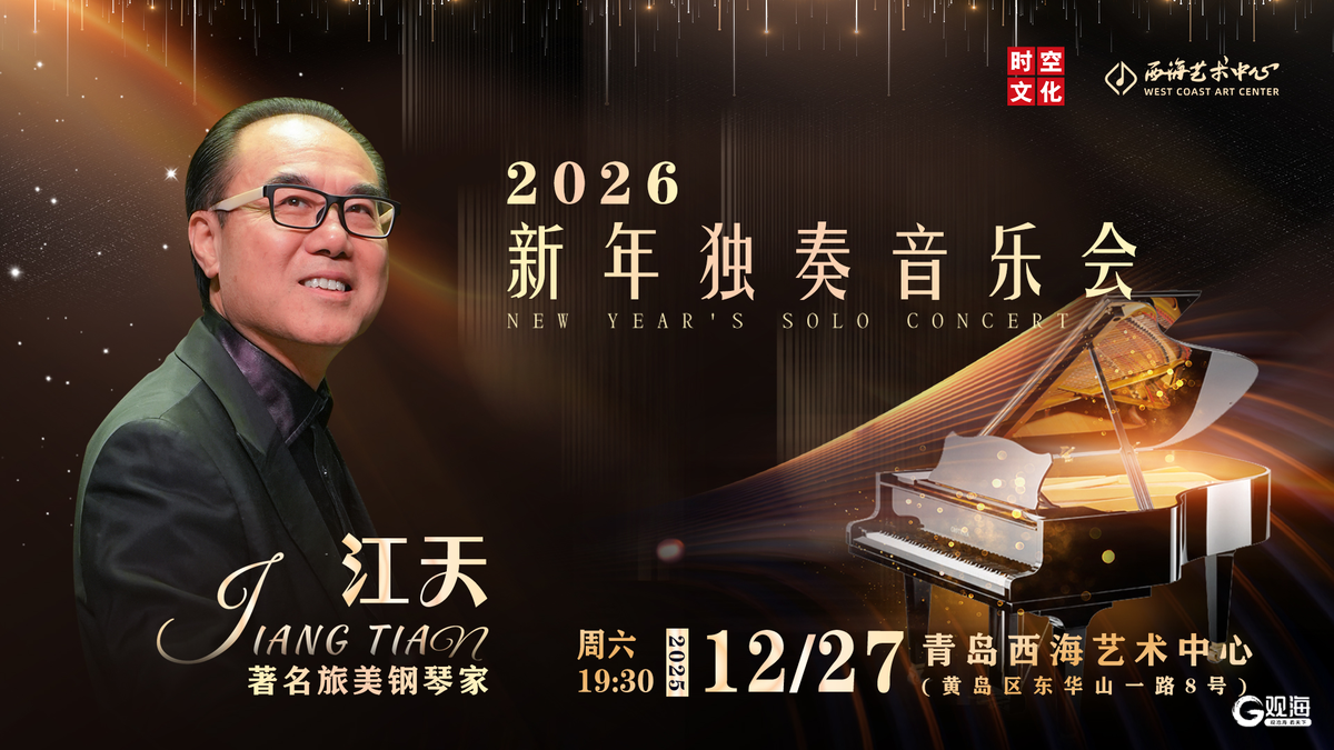12月27日,享誉国际的钢琴家江天将带来新年独奏音乐会,演出时长约110分钟。