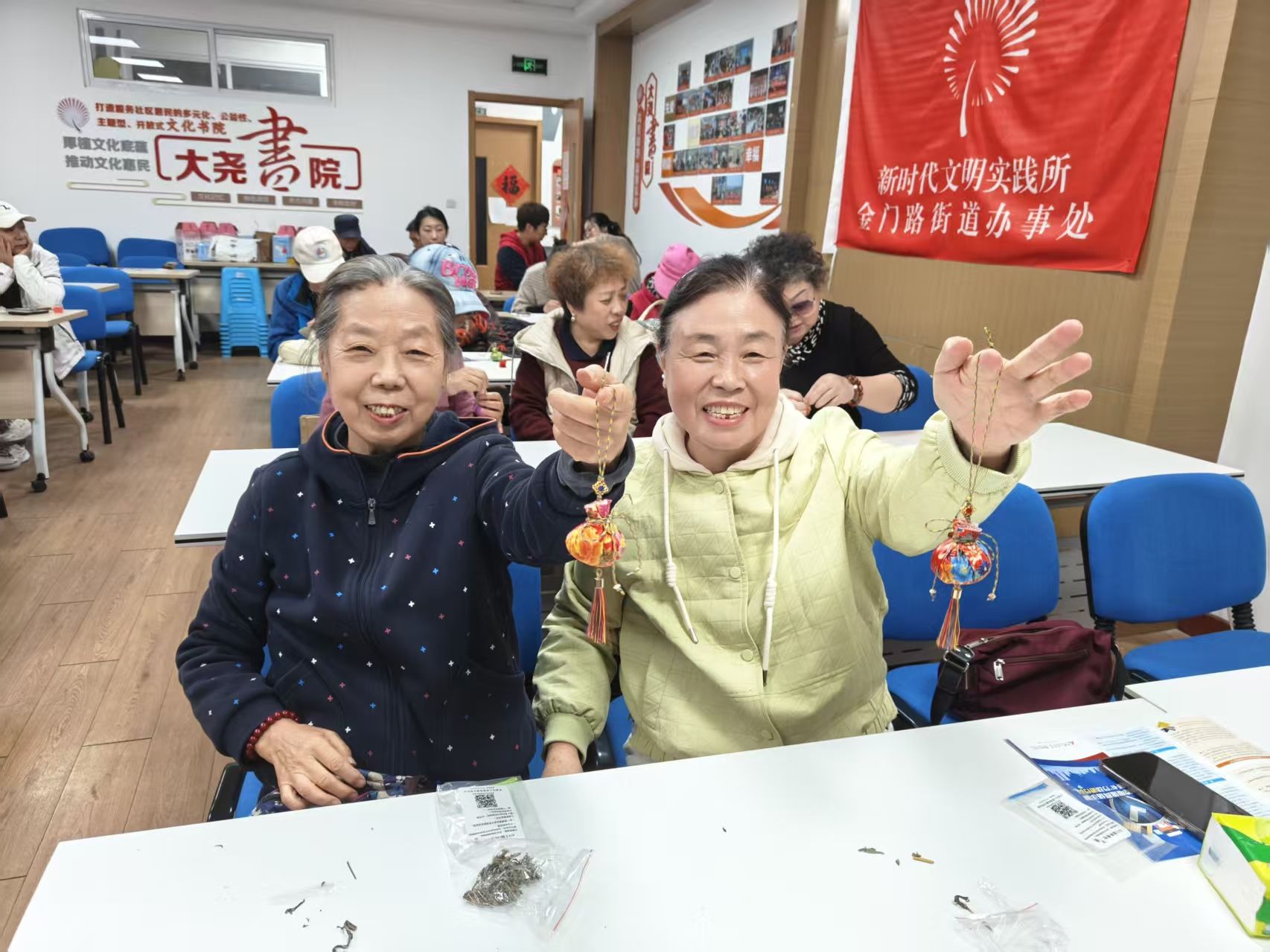 不一会儿,一个个造型各异、精巧别致的香囊便在大家的巧手中诞生了。看着自己亲手完成的精美作品,每位居民脸上都洋溢着满足和自豪的笑容。大家纷纷举起自己的香囊合影留念,记录下这充满成就感的温暖瞬间。