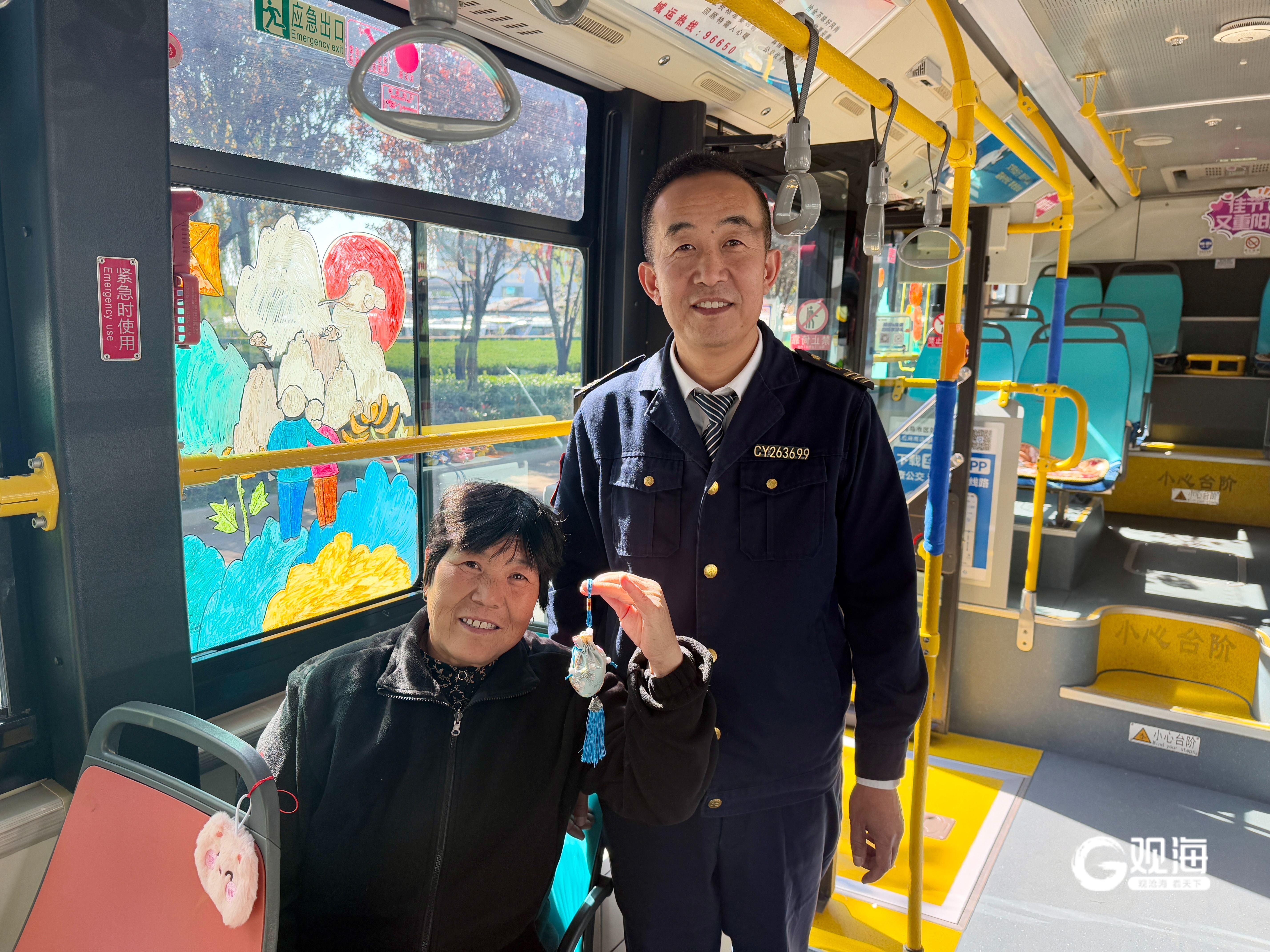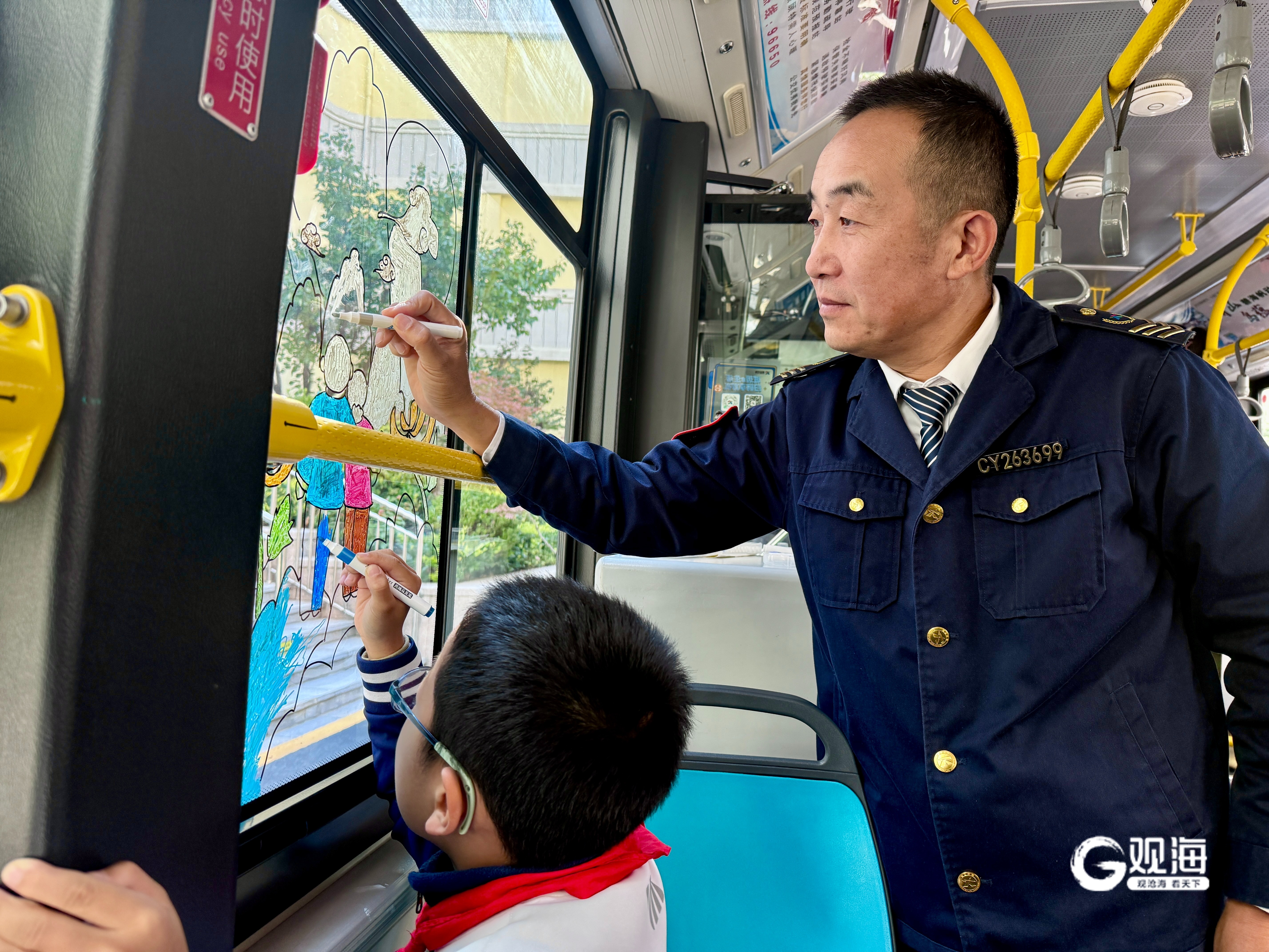 车窗上,菊花盛开、登高望远、阖家团圆……在小学生们的手中勾勒,每一笔都蕴含着对节日的纯真祝福和对老人的深切关怀。随着车厢装饰完成,小学生们和驾驶员手持祝福牌,让欢笑与温馨的瞬间定格在车厢内。