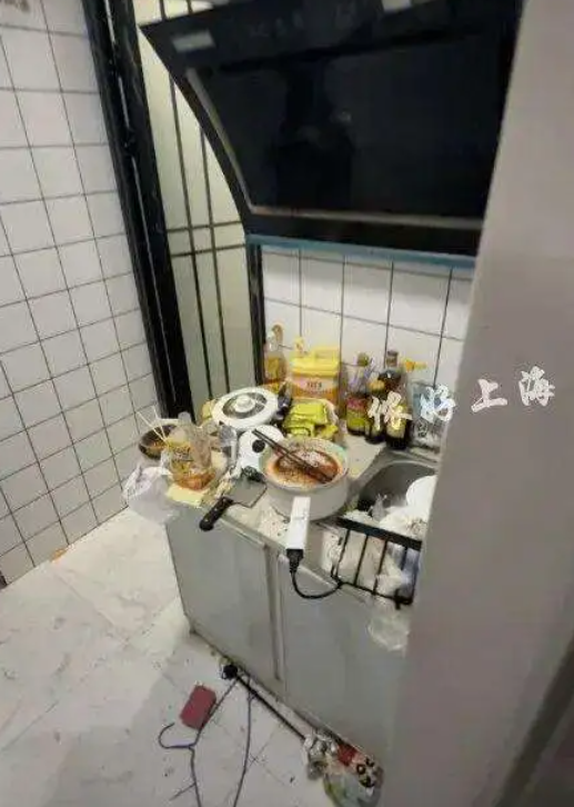 灶台上堆满了吃剩下没扔的外卖盒,还有不知道放了多久的用过没洗的锅碗瓢盆各种餐具。房间里更是满地狼藉苍蝇乱飞,仿佛一个让人无处下脚的大型垃圾场。