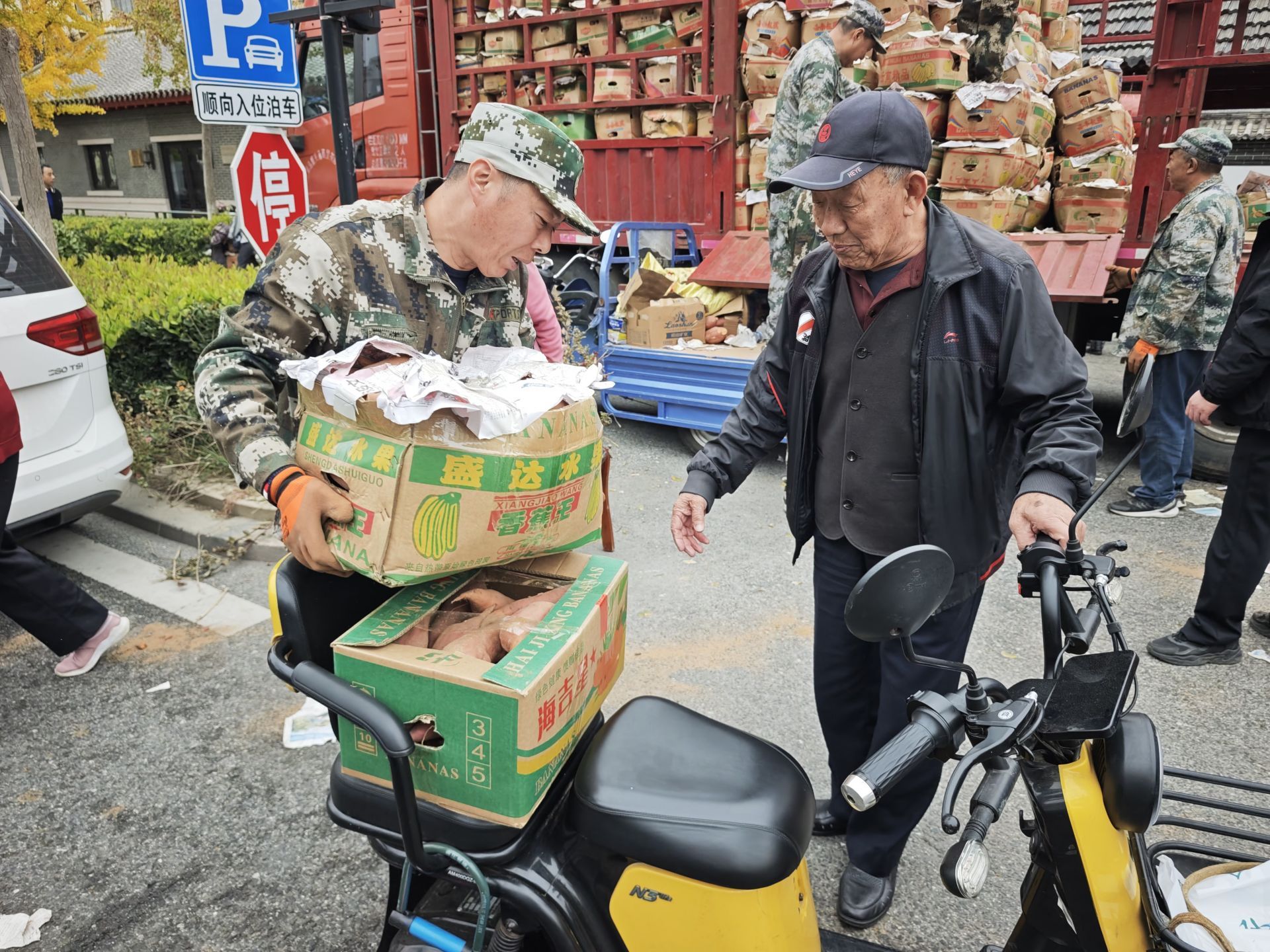 送红薯当天,天未亮社区工作人员便早早到位,两卡车刚从莱阳基地出土的红薯整齐码放,夹杂着新鲜泥土的自然气息。为了让发放高效有序,工作人员早已提前明确分工:有人仔细核对居民信息,确保福利精准送到每一户;有人在现场耐心引导秩序,避免拥挤;还有人主动上前搭把手,帮年老居民把沉甸甸的红薯箱搬上车。现场没有杂乱的喧闹,只有工作人员的热情招呼与居民的轻声道谢,热闹又温馨的氛围,悄然驱散了深秋的清冷。
