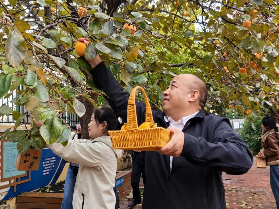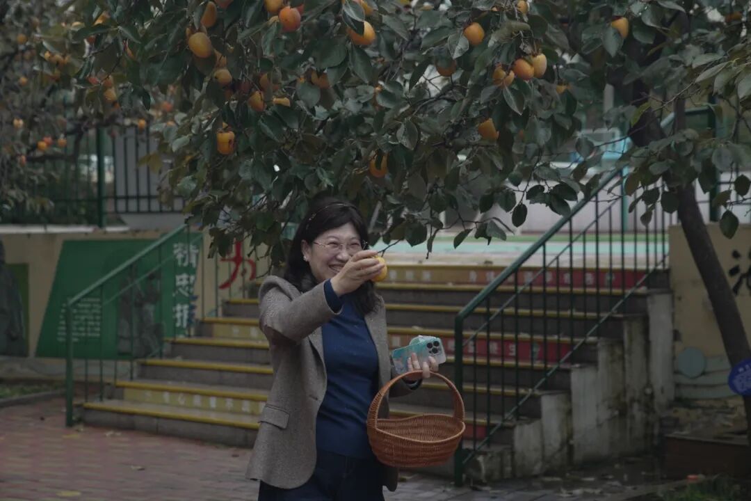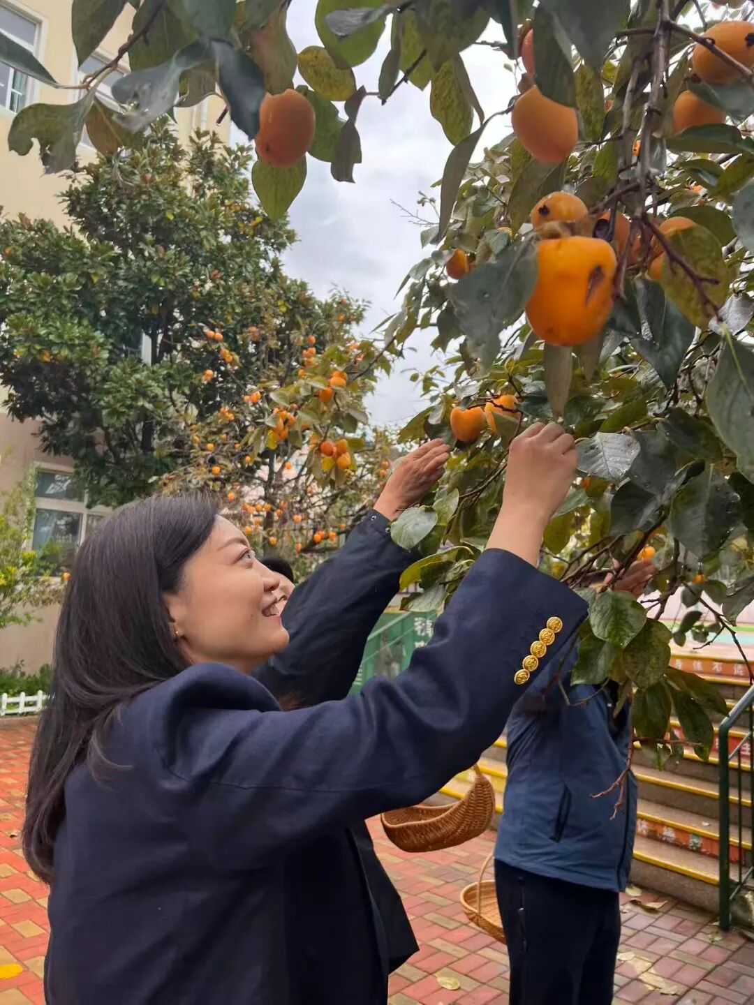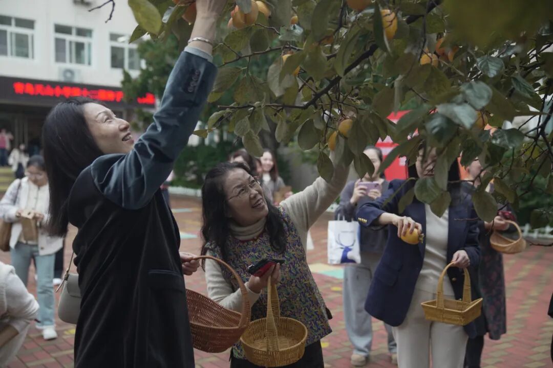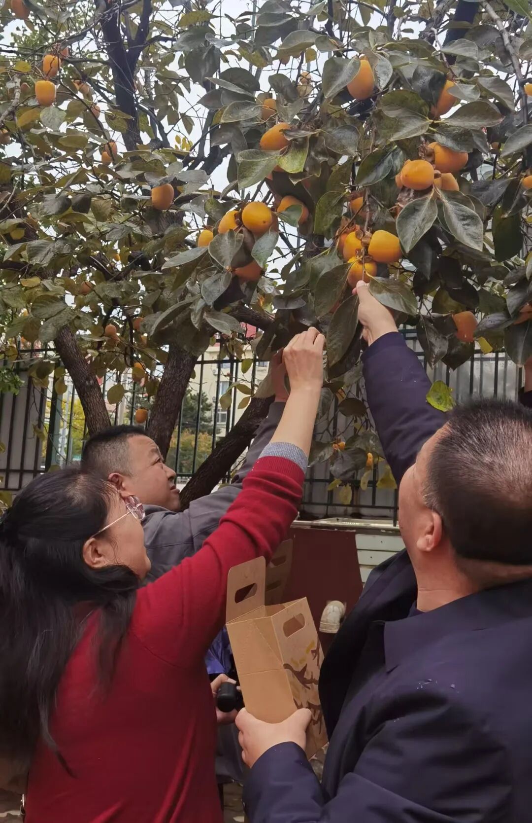开幕式结束后,领导、嘉宾们一同走到柿子树下,小心翼翼地摘下一个个成熟的柿子。大家手持小竹篮、手绘柿子礼盒,或踮脚、或协作,将沉甸甸的柿子收入其中,满脸洋溢着丰收的喜悦。学生们也是兴奋不已,他们在老师和家长的保护下爬上梯子,伸出小手,触摸着柿子,感受着大自然的馈赠。
