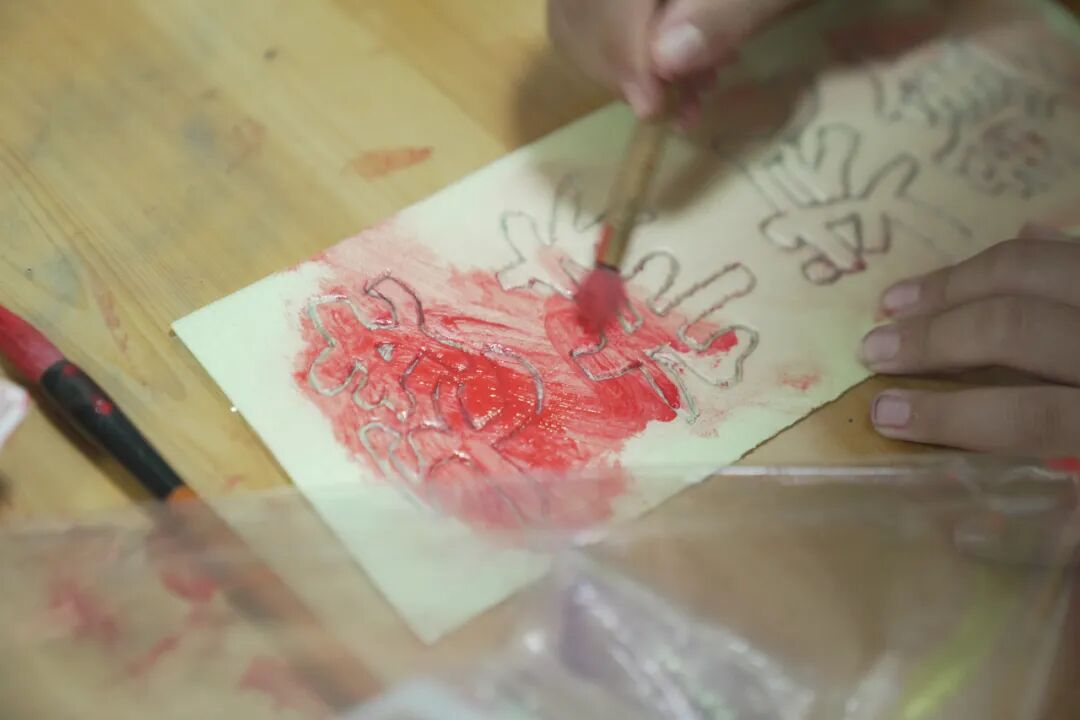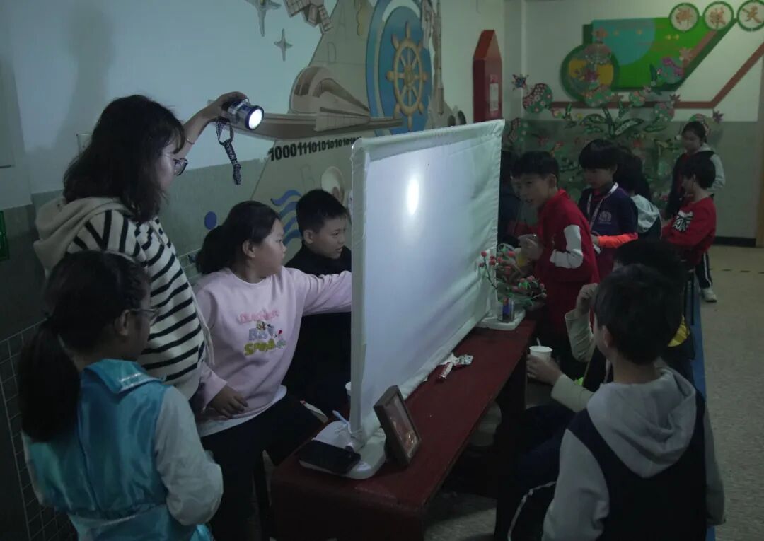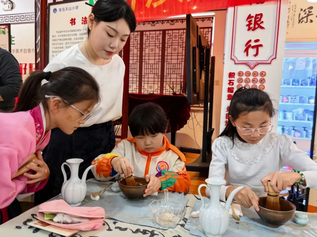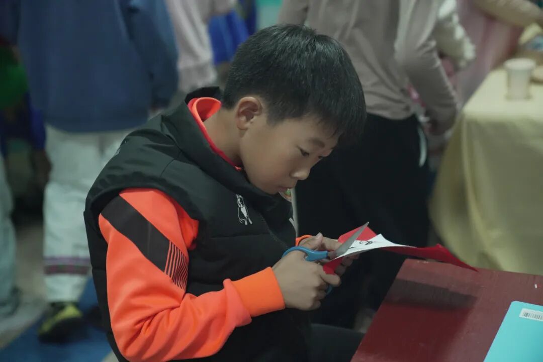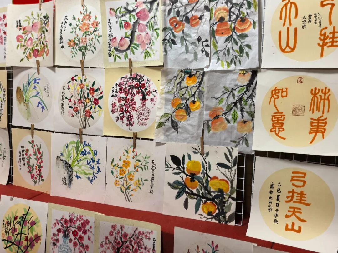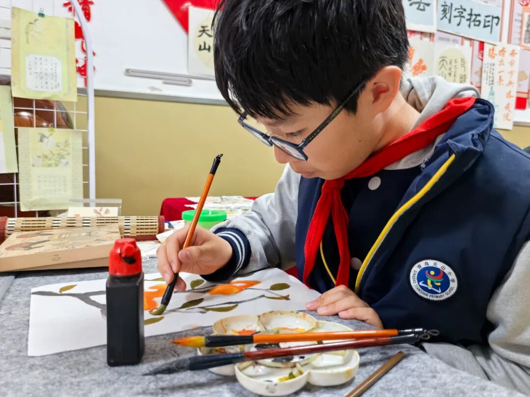 各楼层中厅的非遗体验摊位前热闹非凡,同学们穿梭于各个摊位,沉浸式感受传统文化魅力。光影摇曳间,同学们操控皮影人物演绎故事情节,在幕布后体会民间艺术的灵动;红纸在学生指尖翻转,一张张“柿”形剪纸鲜活灵动,非遗技艺在童心巧手下焕发生机;还有的同学学习茶艺,在茶香中领悟传统文化的雅致;学生手持毛笔,在笔墨晕染间,一个个憨态可掬的“柿柿如意”国画作品诞生......