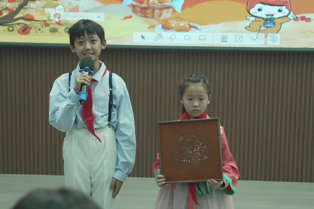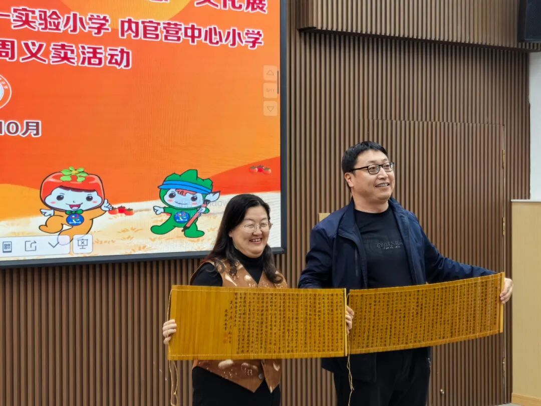 甘肃省定西市安定区第一实验小学与内官营中心小学的领导和老师们也为学校送上了珍贵的礼物,表达了两地之间携手前进的深厚情谊;王冬梅校长讲解非遗传统工艺——柿染,并鼓励学生用时间去探索,用实践去传承我们的文化;杨璐老师发表致辞,不仅高度肯定了活动的重要意义,更寄语全体师生以此次活动为契机,深耕文化底蕴,共筑成长之路。