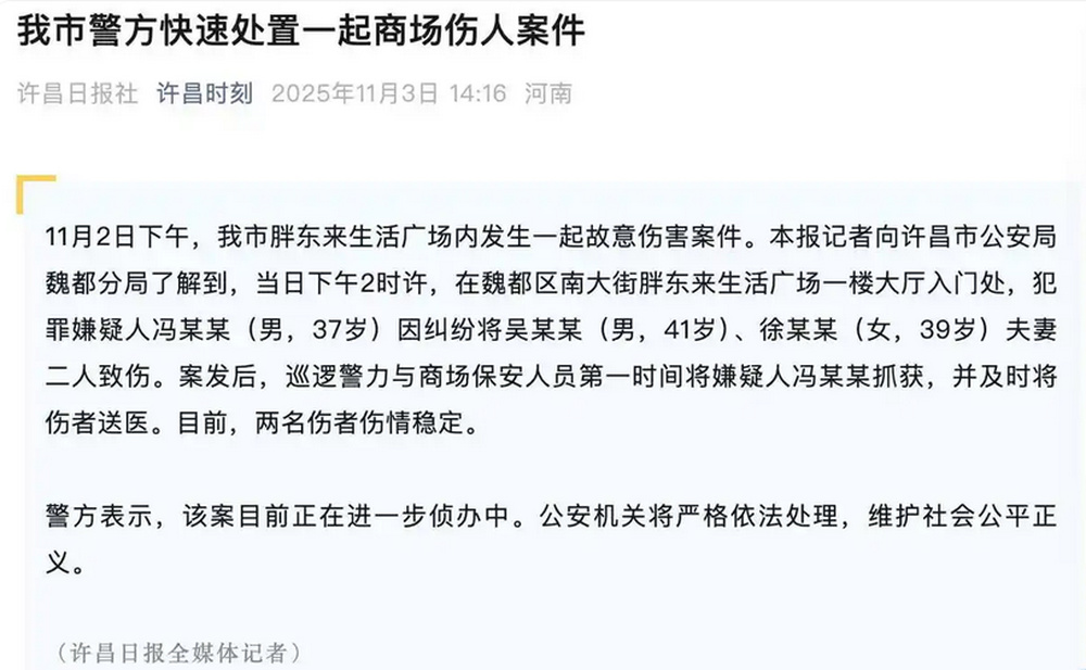 11月2日下午,河南许昌市胖东来生活广场内发生一起故意伤害案件。记者向许昌市公安局魏都分局了解到,当日下午2时许,在魏都区南大街胖东来生活广场一楼大厅入门处,犯罪嫌疑人冯某某(男,37岁)因纠纷将吴某某(男,41岁)、徐某某(女,39岁)夫妻二人致伤。案发后,巡逻警力与商场保安人员第一时间将嫌疑人冯某某抓获,并及时将伤者送医。目前,两名伤者伤情稳定。
