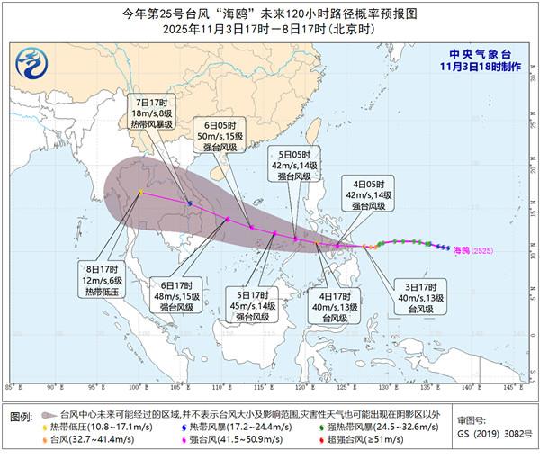 今年第25号台风“海鸥”仍在发展中,今天夜间到明天凌晨登陆菲律宾中部沿海(台风级或强台风级,40—45米/秒,13—14级),以后穿过菲律宾中部,将于5日早晨移入南海东南部海面,强度将继续加强,最强可达强台风级(45—50米/秒,14—15级),6日夜间逐渐趋向于越南中部沿海。