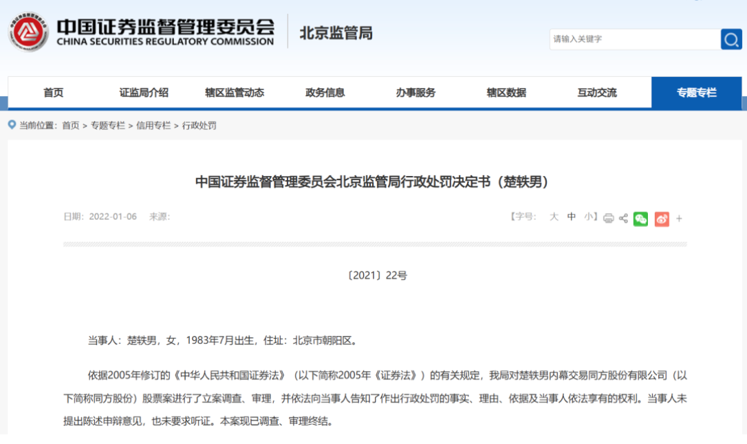 2022年1月,北京证监局披露的一份行政处罚决定书揭露了更多与本案相关的细节。当事人名为楚轶男,毕业于北京电影学院,是中国内地女演员,曾出演《精武陈真》《一起来看流星雨》等电视剧。她与科瑞天诚董事长郑某文日常联系频繁,关系非常密切。在知悉内幕信息后,楚轶男利用相关信托计划进行内幕交易。她承认,购买“聚鑫弘扬11号”的资金来源正是郑某文给予的买房资金。