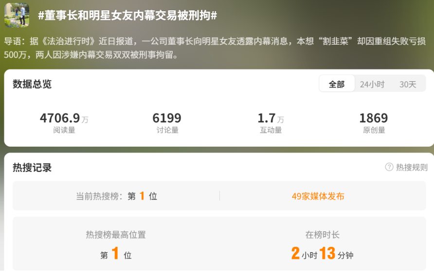 近日,一则“董事长和明星女友内幕交易被刑拘”的消息冲上热搜,引发广泛关注。