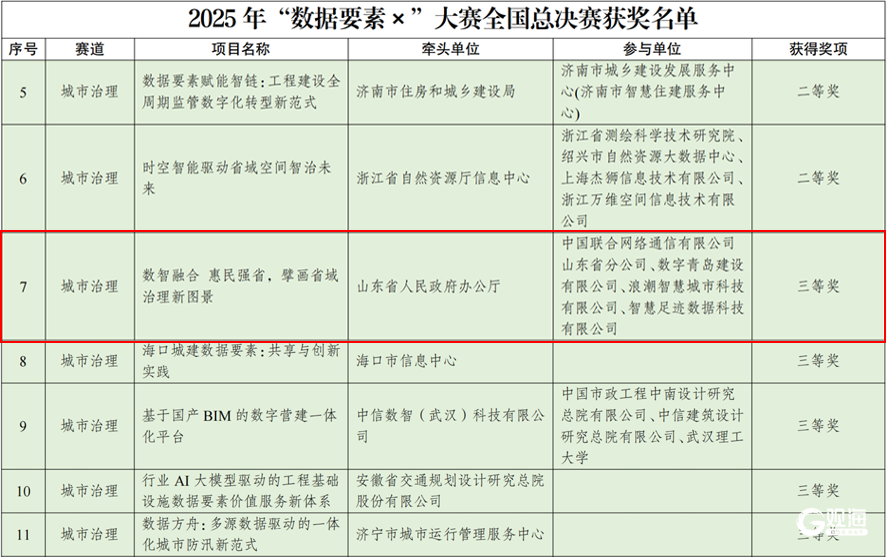 由山东省人民政府办公厅牵头,联合青岛数据集团旗下数字青岛建设有限公司、中国联通山东分公司等多家单位共同申报的“数智融合惠民强省,擘画省域治理新图景”项目,历经多轮激烈角逐,最终荣获“城市治理”赛道全国总决赛三等奖,并位列该赛道全国第七。