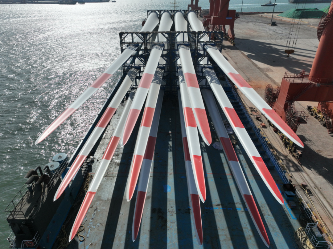 图为东方电气风电(山东)有限公司的海上风电叶片从蓬莱港出运。(资料图片)