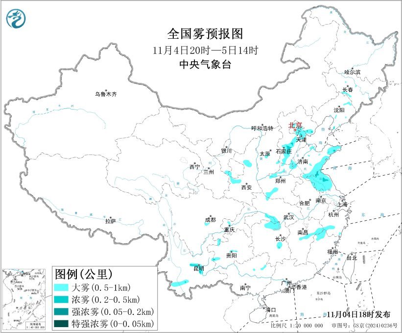 预计,11月4日夜间至5日上午,北京大部、天津、河北中南部、河南北部、山东北部和东部、江苏中北部、湖南北部、江西中部、浙江西南部、福建西北部、云南中部等地的部分地区有大雾,局地有能见度不足500米的浓雾。
