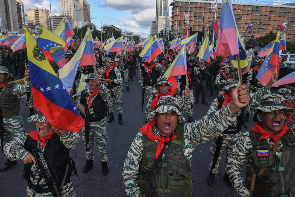9月23日,在委内瑞拉首都加拉加斯,民兵组织成员挥舞委内瑞拉国旗参加游行,反对美国在加勒比海域的军事威胁。新华社发(马科斯·萨尔加多摄)