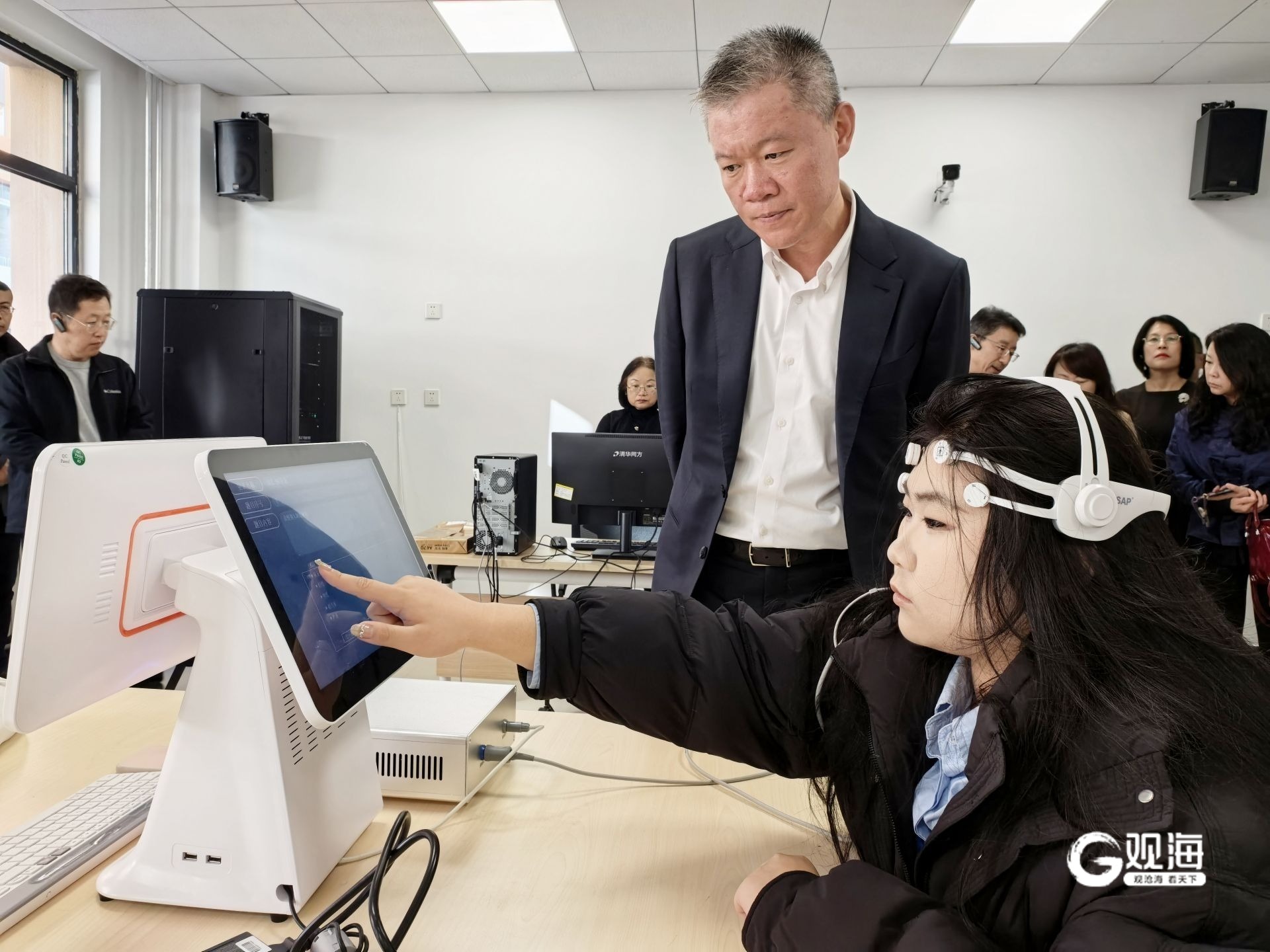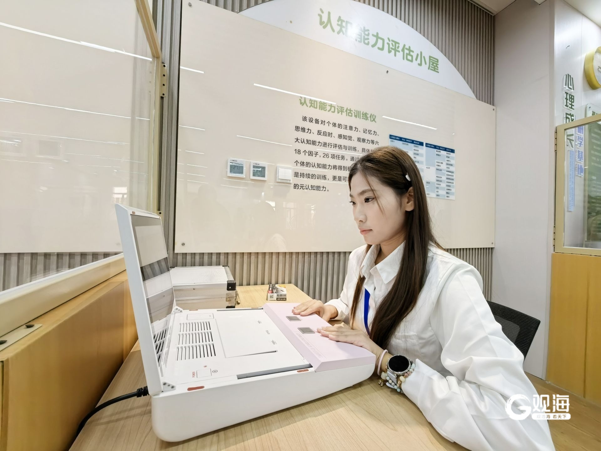 青岛市学生心理健康发展服务中心的工作人员在操作仪器。