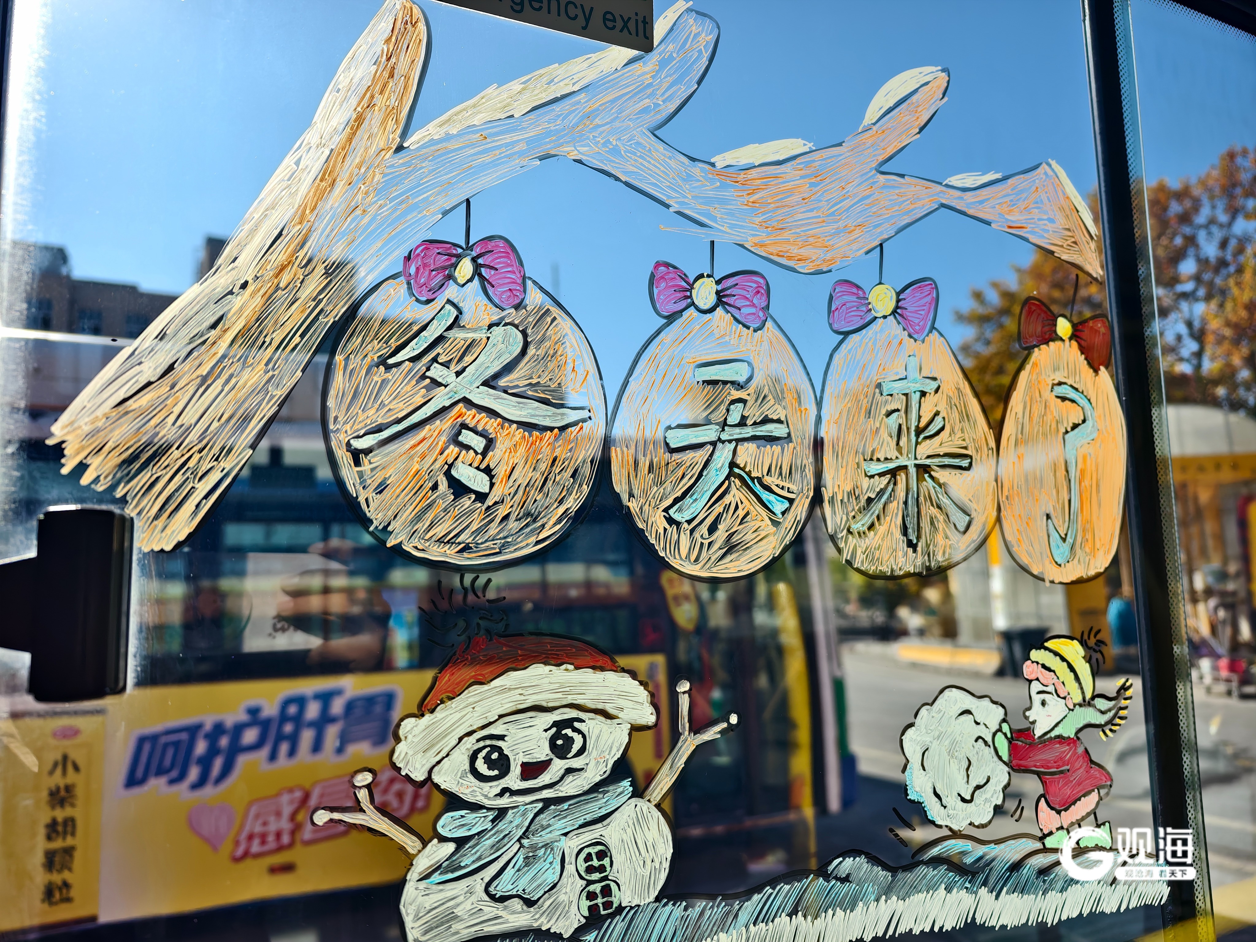 最引人注目的,是张叶与孩子们在车窗上绘制的创意画作。大家将冬日里最受欢迎的“立冬四件套”——裹着糖衣的糖葫芦、冒着热气的奶茶、粉糯香甜的板栗、烤得暖手的红薯一一呈现;旁边车窗上还画着圆滚滚的雪人和热腾腾的水饺……每一幅画面都洋溢着浓郁的生活气息,让乘客一上车就仿佛步入热闹的冬日集市,沉浸式感受立冬的温暖与诗意。