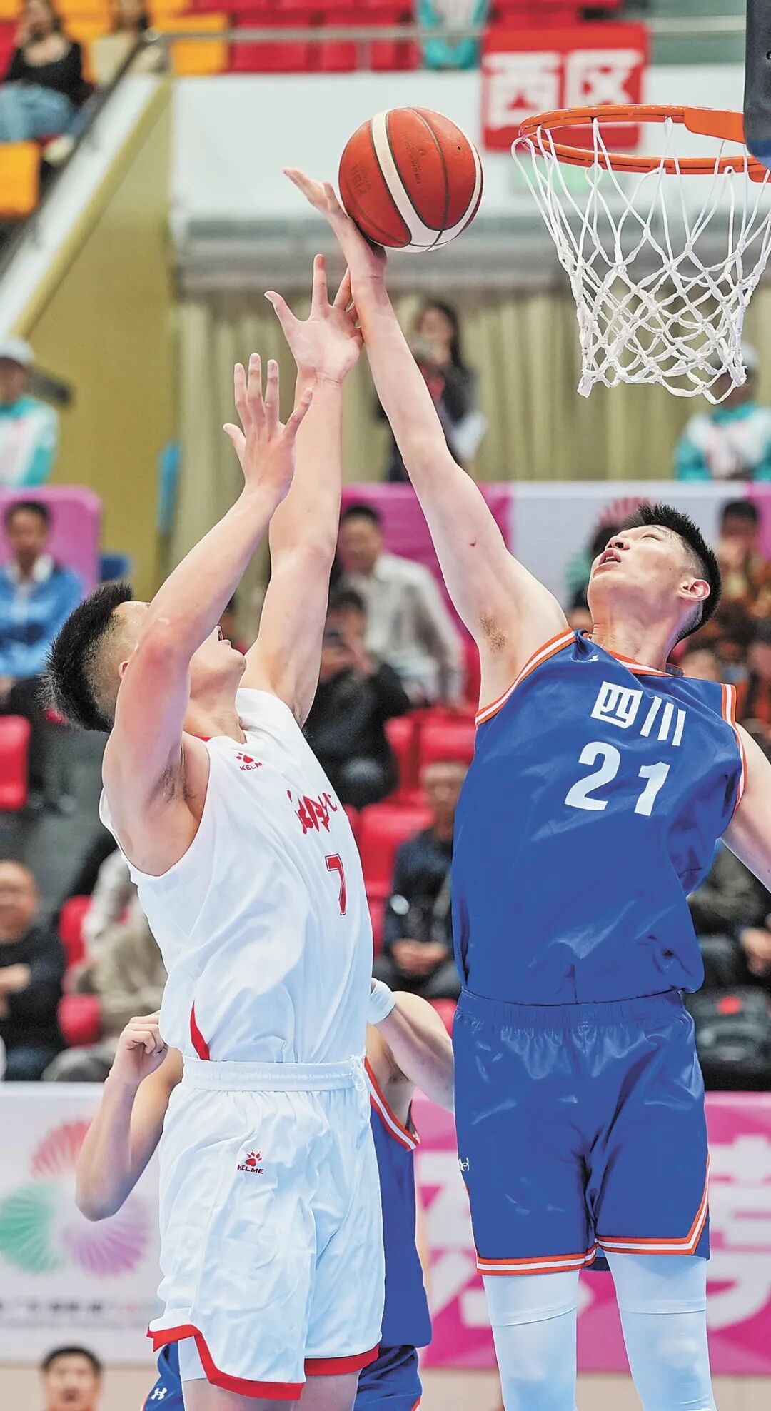 十五运会篮球男子成人组小组赛,球员在比赛中拼抢。新华社记者 李博 摄