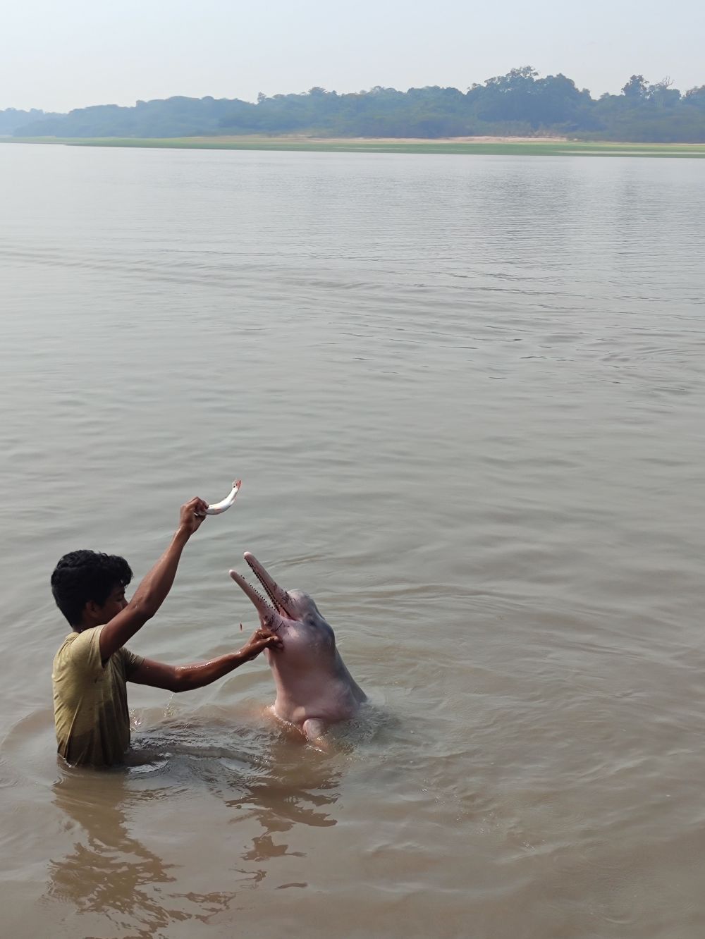 2023年11月18日,在巴西亚马孙州阿卡贾图巴湖畔的阿卡贾图巴村,一位当地村民给亚马孙河豚喂食(手机照片)。新华社记者夏晨摄