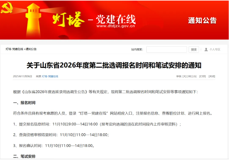 11月6日,山东省委组织部发布《关于山东省2026年度第二批选调报名时间和笔试安排的通知》,根据《山东省2026年度选拔录用选调生公告》等有关规定,就第二批选调报名时间和笔试安排等事项通知如下: