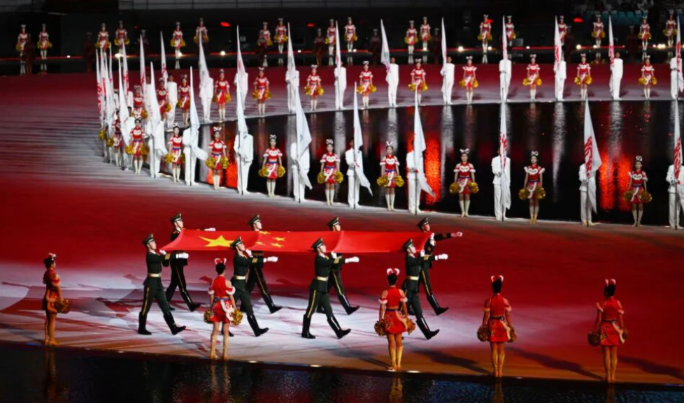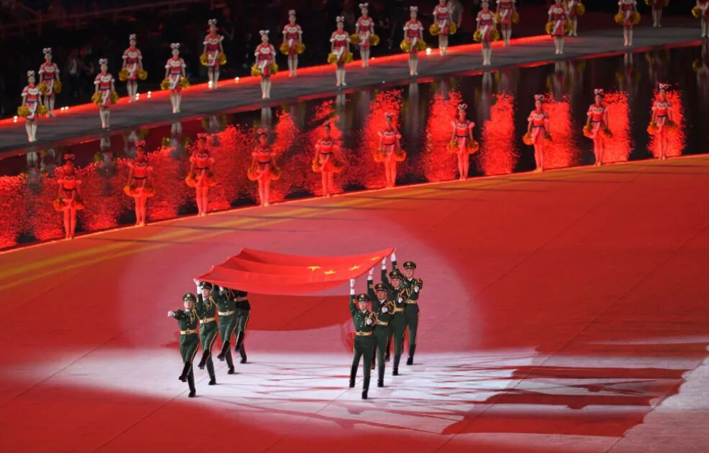 旗手护送中华人民共和国国旗入场。新华社记者 杨冠宇 摄