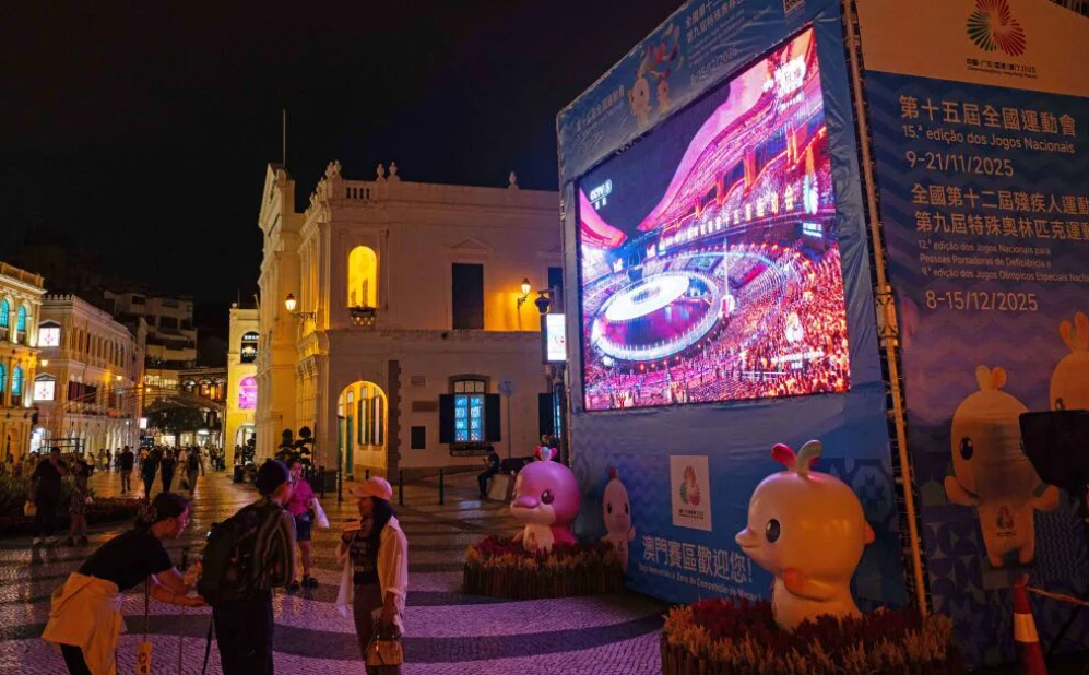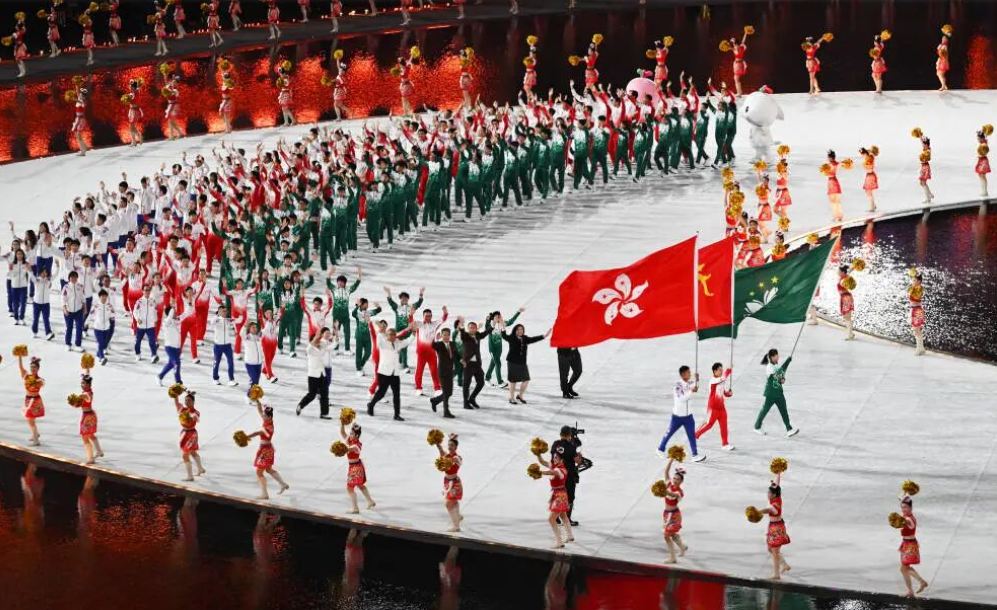 广东省体育代表团、香港特别行政区体育代表团、澳门特别行政区体育代表团在入场仪式上共同入场。新华社记者 江汉 摄