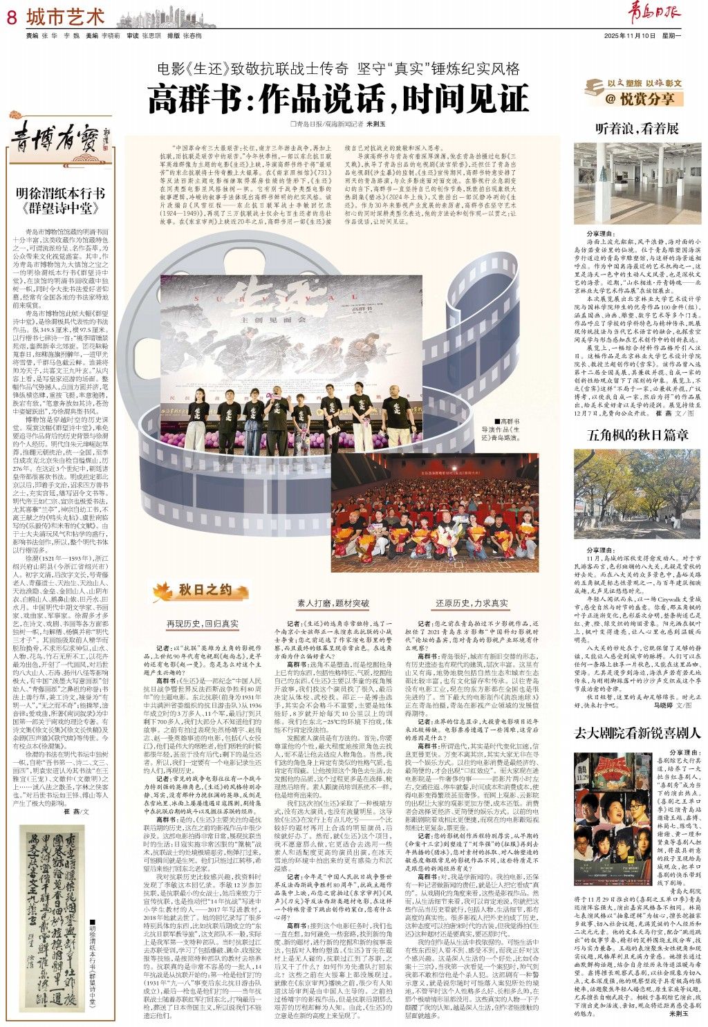 高群书:青岛很好,城市有新旧交替的形态,有历史遗迹也有现代的建筑,层次丰富。这里有山又有海,地势地貌包括自然生态和城市生态都比较丰富,也有文化留存和传承。以往青岛没有电影工业,现在的东方影都在全国也是很先进的了。当下最大的电影制作《流浪地球3》正在青岛拍摄,青岛在影视产业领域的发展值得期待。