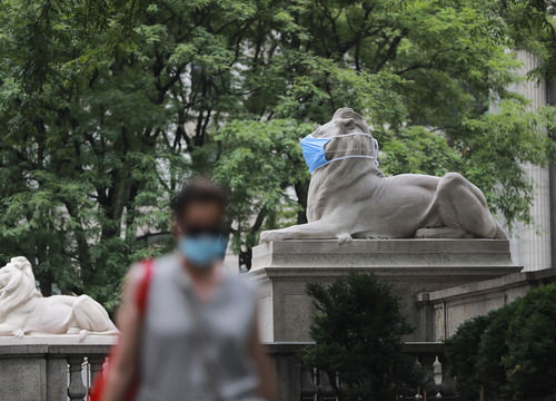 这是2020年7月8日在美国纽约公共图书馆前拍摄的“戴”口罩的石狮子。新华社记者王迎摄