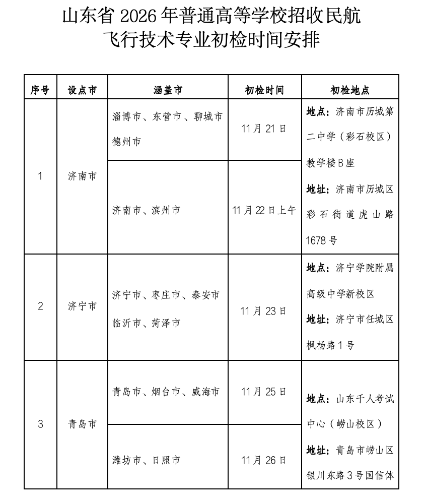 招飞各项选拔工作由各招生高校具体组织实施。山东在济南、青岛、济宁3市设立招飞初检站。考生需在规定时间、地点,携带身份证及招生高校规定的证件材料,参加相应招生高校组织的初检预选。