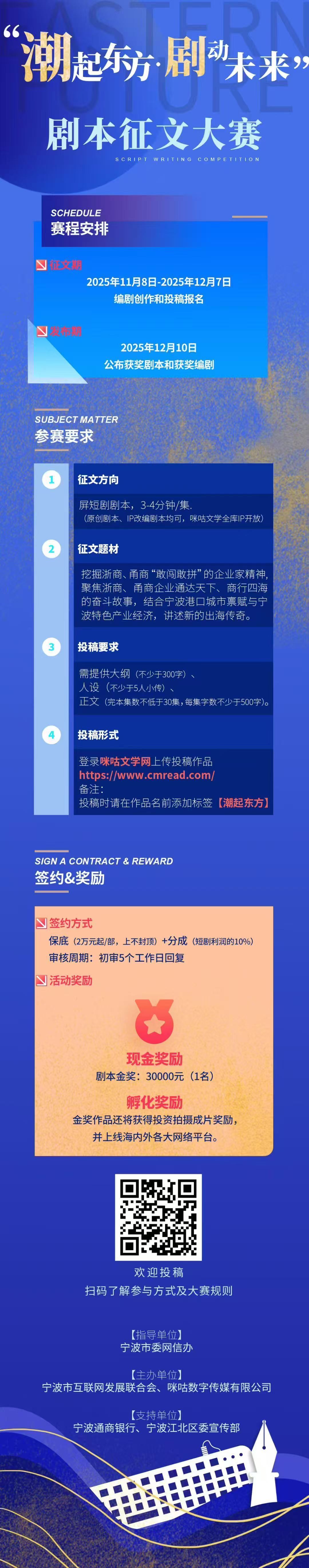 参赛剧本需以竖屏短剧形式呈现,每集3至4分钟,聚焦浙商、甬商企业通达天下、商行四海的奋斗故事,结合宁波港口城市禀赋与宁波特色产业经济,以喜闻乐见的短剧形式,讲述新的出海传奇。既欢迎原创剧本,也开放咪咕文学全库IP进行改编。