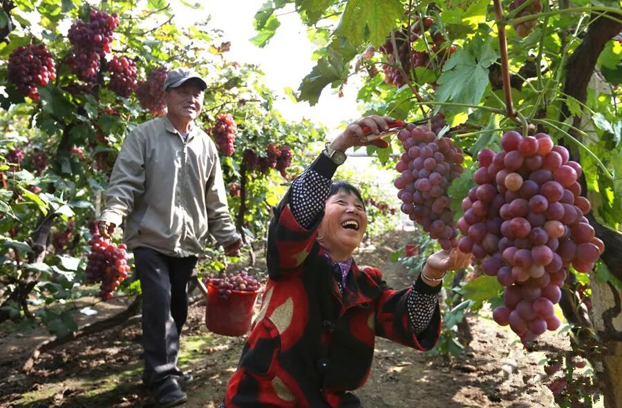 莱西市村民正在采收成熟的葡萄。