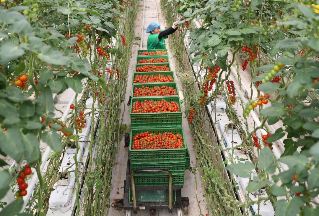 在凯盛浩丰(莱西)智慧农业产业园内,工人正采摘西红柿。张进刚 摄