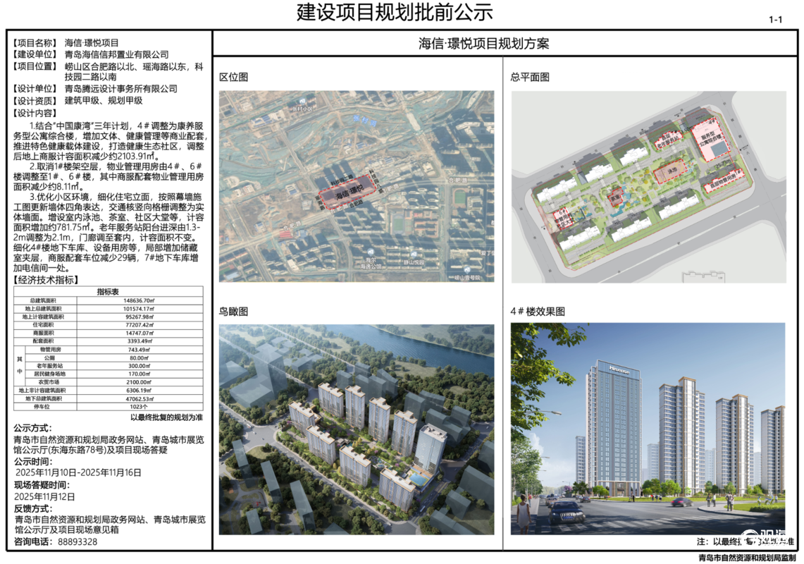 青岛日报社/观海新闻11月12日讯 日前,青岛市自然资源和规划局发布海信•璟悦项目规划方案批前公示。项目位于崂山区合肥路以北、瑶海路以东,科技园二路以南,由青岛海信信邦置业有限公司负责建设。