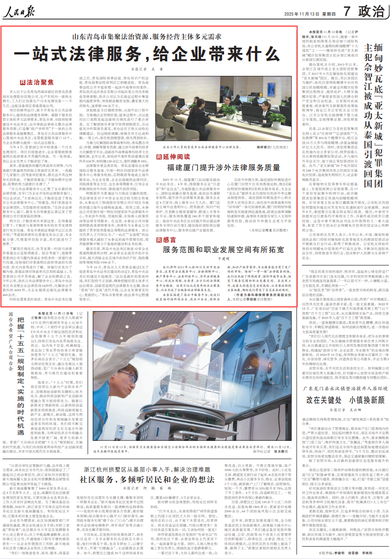 今年10月,青岛市人大常委会通过《关于促进青岛中央法务区建设的决定》,青岛中央法务区的建设日趋规范。“法治是最好的营商环境,我们坚持守正创新,精准把握经营主体多元法治需求,创新营造现代法律服务生态圈,推动‘营商’向‘宜商’迭代升级,让企业发展更有信心、更感舒心。”青岛市委常委、政法委书记程德智表示。