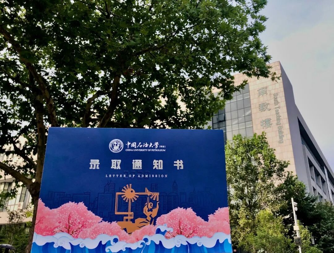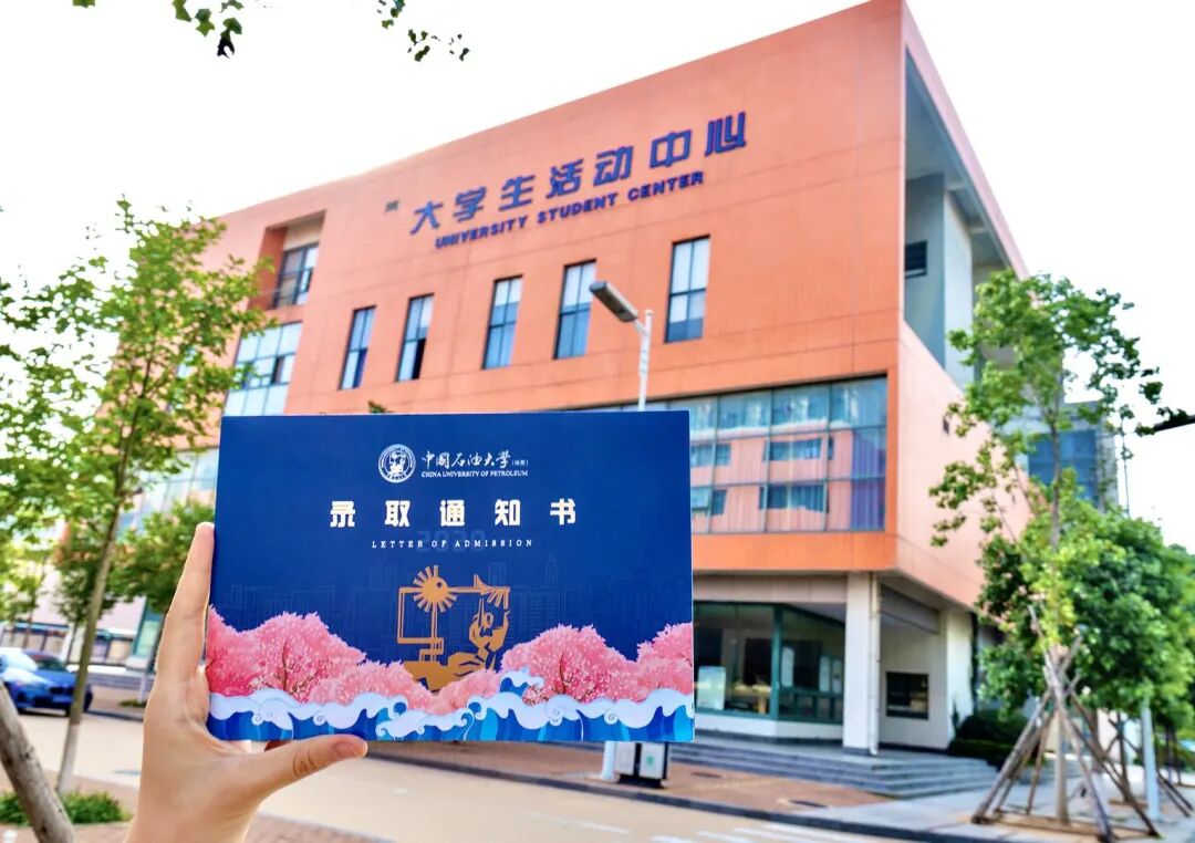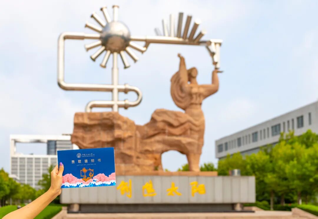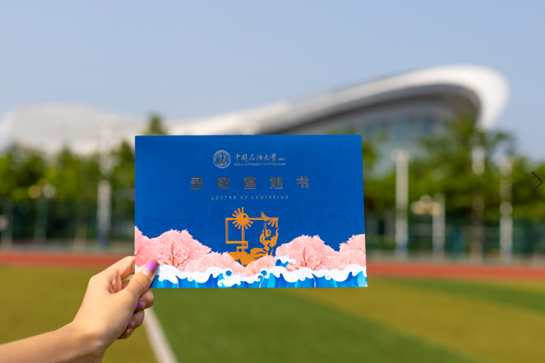 2020年中国石油大学(华东)的录取通知书,采用了“视觉立体”式的结构布局,质感较之往年有所提升。将“观涛听海”的地理位置和”樱花飞舞“的校园风光结合,巧妙地展示了石大”面朝大海,春暖花开“的美丽校园。通知书封面中心的“创造太阳”雕塑是学校的标志性建筑,寓意一代又一代石大人运用知识能源开发物质能源,同心家国、追求卓越,创造出一个新的太阳。