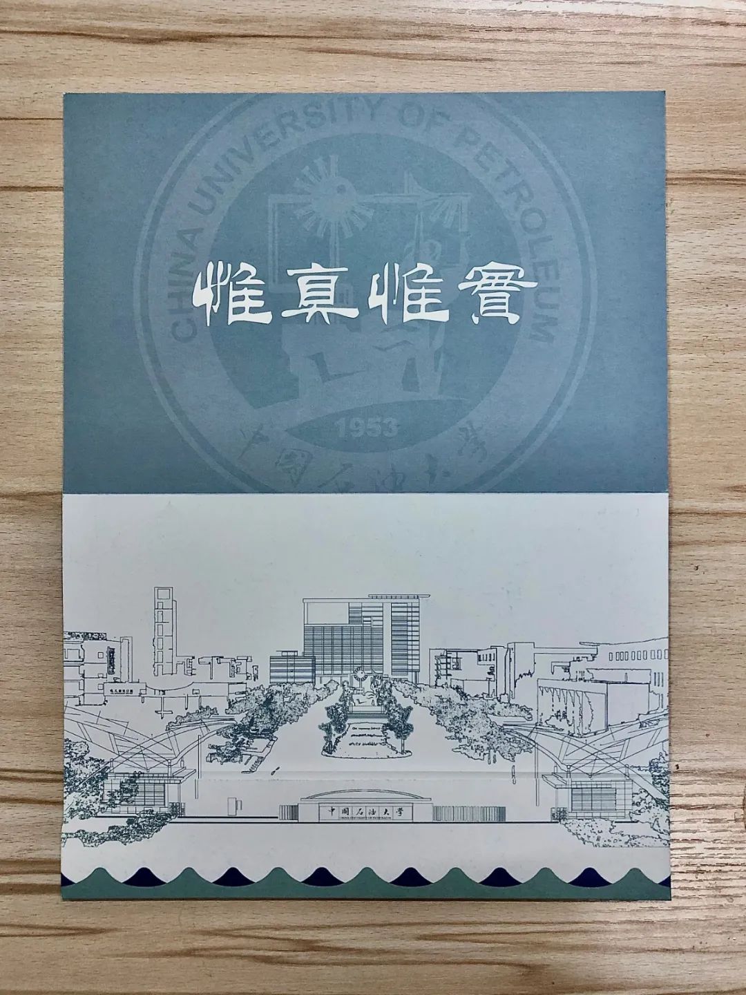 封套内页上半部分以校标为背景,覆以校训,凸显石大对真与实的不懈追求。配色选用轻柔沉稳的灰蓝色系,体现能源行业的气息。下半部分为学校南大门全景图,与学生初到学校看到的景别秩序一致,强调代入感。抽象海浪配以装饰,突显层次感,内页设计成“插槽”样式,不仅方便取阅,也不破坏整体设计的气氛。