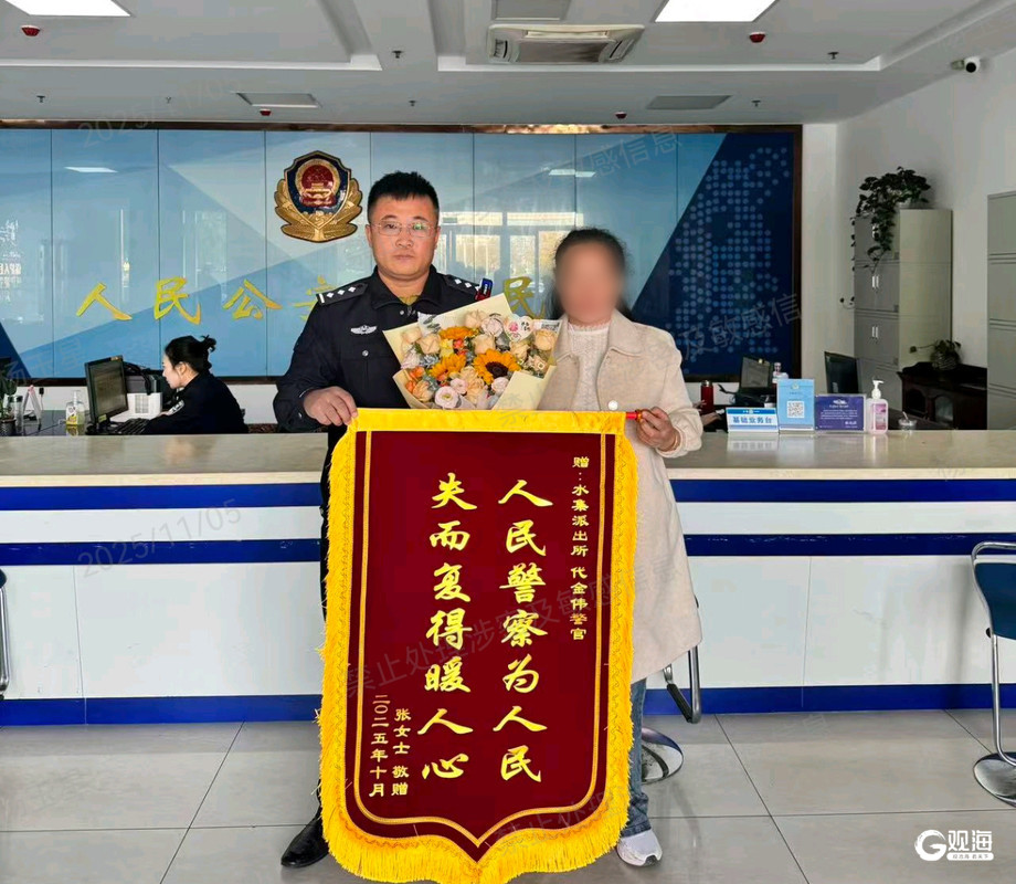 11月6日上午,莱西市民张女士带着一面印有“人民警察为人民 失而复得暖人心”的锦旗赶到莱西市公安局水集派出所,对民警快速帮助找回丢失的白酒表示感谢。