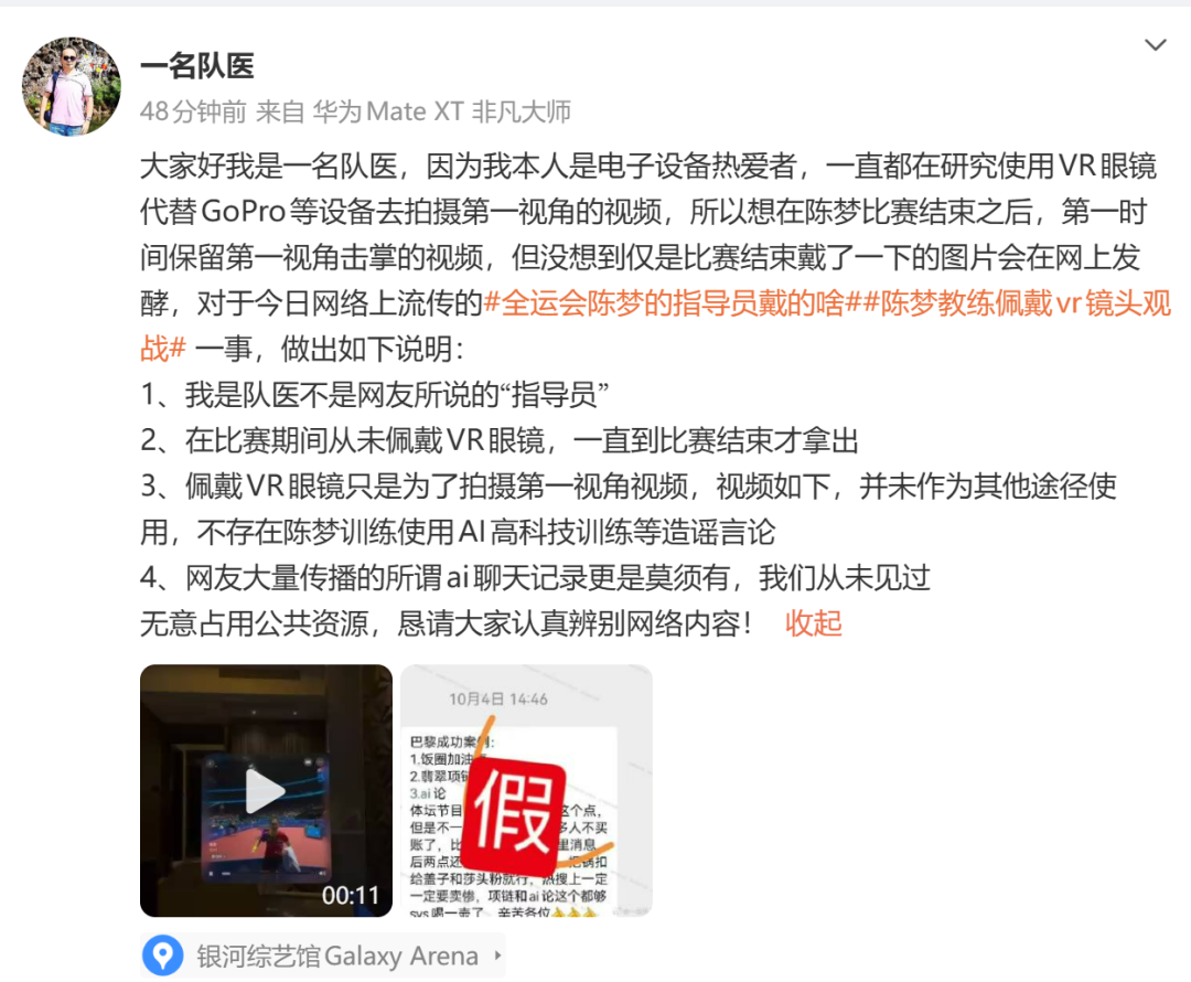 11月14日,陈梦队医发博回应佩戴VR眼镜引发的争议: