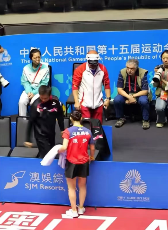 此前,网络流传多张图片,图片显示在全运会乒乓球赛场,疑似陈梦方面一工作人员佩戴VR眼镜观赛,引发争议。