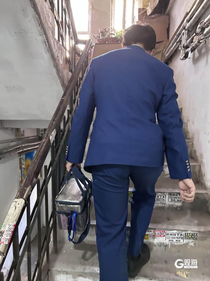 刘嘉宁正在爬楼梯为老人送餐
