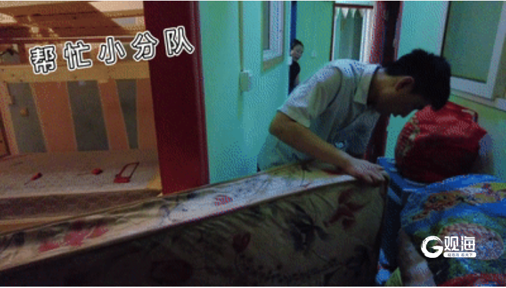 队员们帮助老人打扫卫生、整理家具