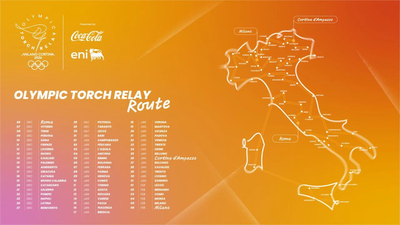 11月26日,奥运圣火将在希腊奥林匹亚古奥运遗址点燃。随后,圣火将在希腊境内进行传统仪式性传递,并于12月4日在雅典的交接仪式上正式移交给意大利代表团。随后圣火将在12月6日从首都罗马正式出发,开启在意大利境内的传递。