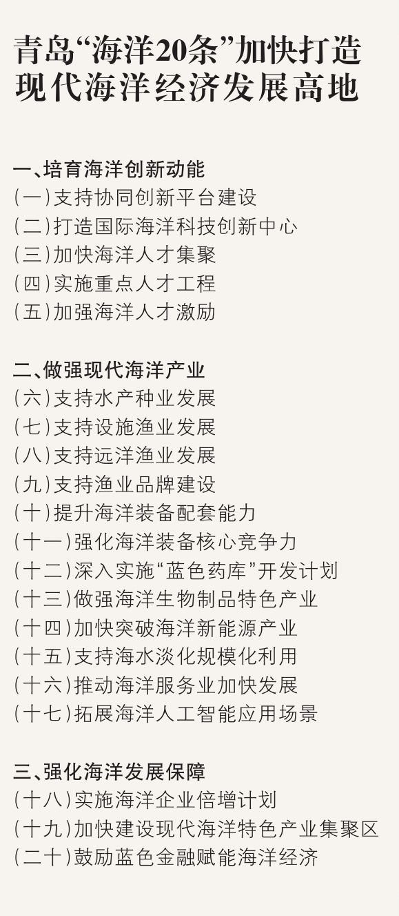 作为关键配套政策,“海洋20条”共3部分、20条具体政策措施,整合了含金量高、导向性强、社会反响好的现行涉海科技、人才、产业政策,并结合青岛海洋发展工作实际情况和产业发展需要,在现代渔业、海洋药物和生物制品、海洋新能源、海洋人工智能等领域进行了政策创新,将为青岛海洋经济高质量发展提供有力支持。