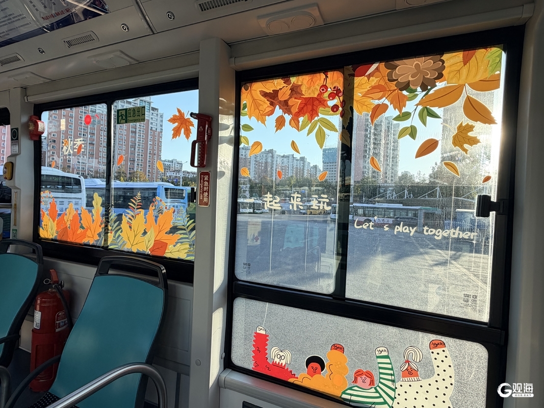 踏入环浮山公交的“秋日主题”车厢,瞬间便被浓郁的秋意包裹。车窗玻璃上精心贴附的金黄落叶贴纸,在阳光映照下光影斑驳,与窗外流动的城市景致交织成一幅动态画卷。这巧妙的设计,让乘客在前往浮山森林公园的途中,便提前置身于山野林趣的诗意氛围里。