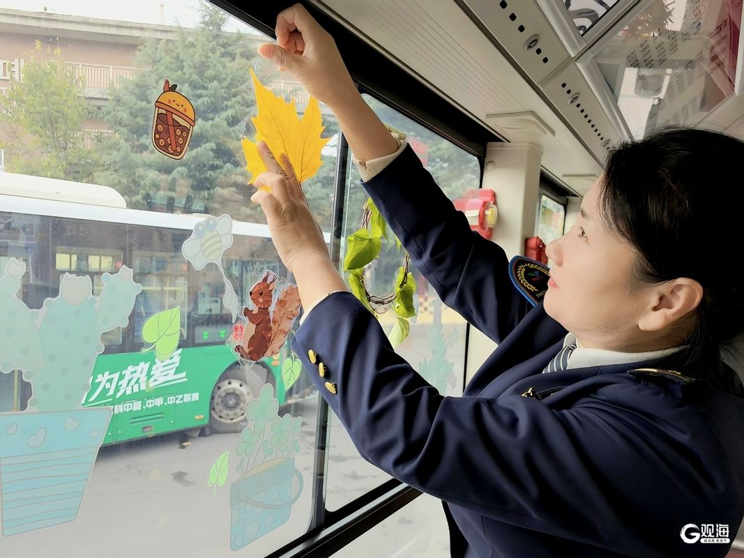 228路驾驶员管涛道出了打造主题车厢的初衷:“步入秋天,香港西路两旁、八大关周边,树叶纷纷换上了金黄的盛装。每年这个时节,都会有大批市民慕名前往八大关赏秋。今年又看到‘落叶缓扫’的新闻,想着能让大家在乘车途中也能感受到浓浓的秋意,便萌生了打造主题车厢的想法。”