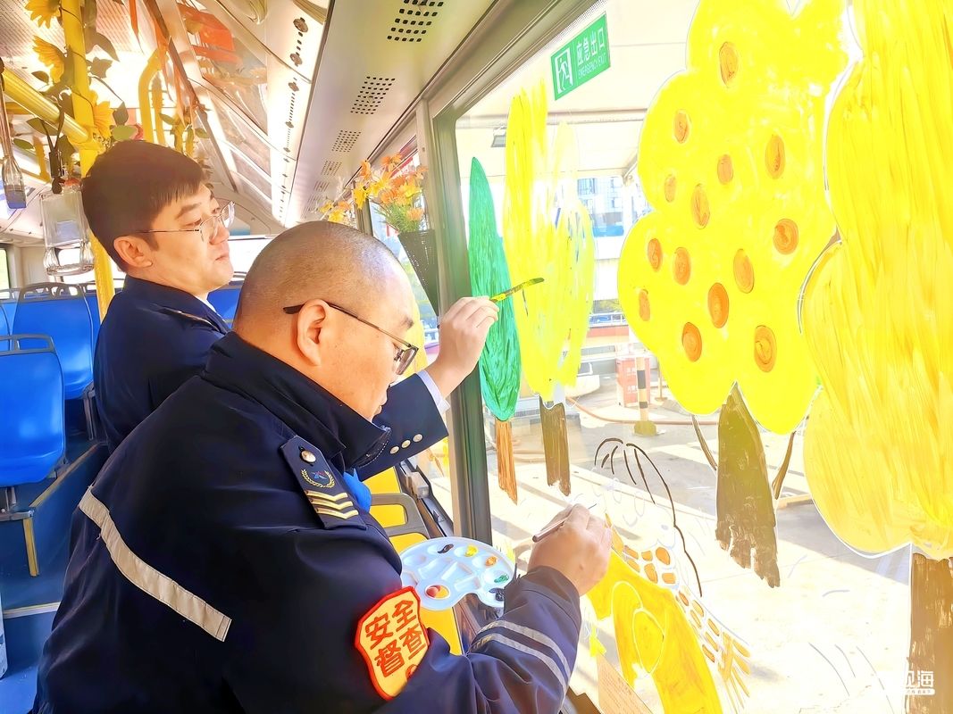 这一想法很快得到了同事们的响应。“青岛巴士”志愿者们利用休息时间,收集秋日图片,准备颜料,在车窗玻璃上手绘出一幅幅生动的秋日画卷:偏黄色的树木错落有致,小朋友欢快地捡着树叶,圆滚滚的南瓜彰显着秋天的丰收喜悦。整个车厢以温暖明亮的黄色为主色调,与窗外如诗如画的秋日美景相互映衬,宛如一幅流动的秋日油画。