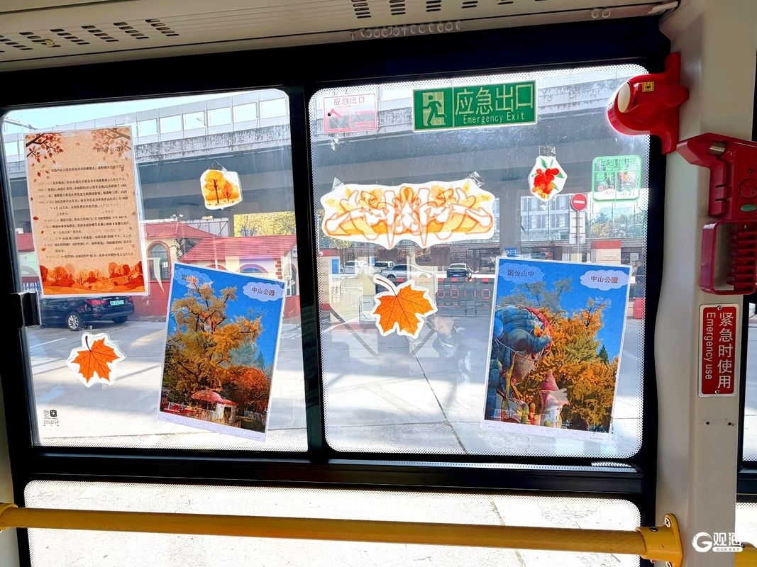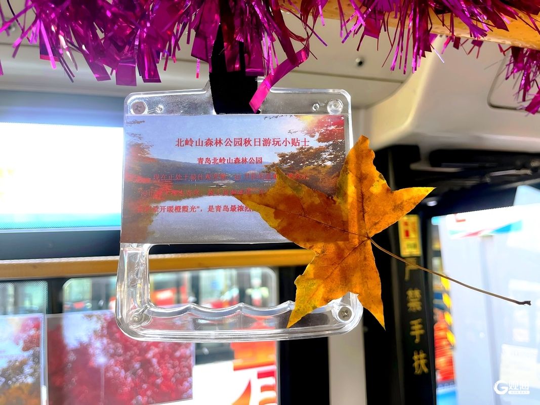 走进371路公交车厢,仿佛踏入了一片迷你枫树林。车窗上张贴着北岭山森林公园的实景摄影作品,棕红、金黄的枫叶交织成画;车厢内壁悬挂着精心设计的赏枫攻略卡片,标注最佳观赏点位、枫叶变色高峰期等核心信息;扶手杆上缠绕着仿真枫叶枝,座椅靠背张贴着温馨标语,每一处细节都弥漫着浓郁的秋意。