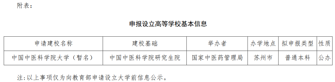根据《中华人民共和国高等教育法》《普通本科学校设置暂行规定》等有关法律法规,经组织专家指导、考察、评议,拟按程序向教育部申报设立中国中医科学院大学(暂名),现予以公示。公示时间为2025年11月20日至11月26日。
