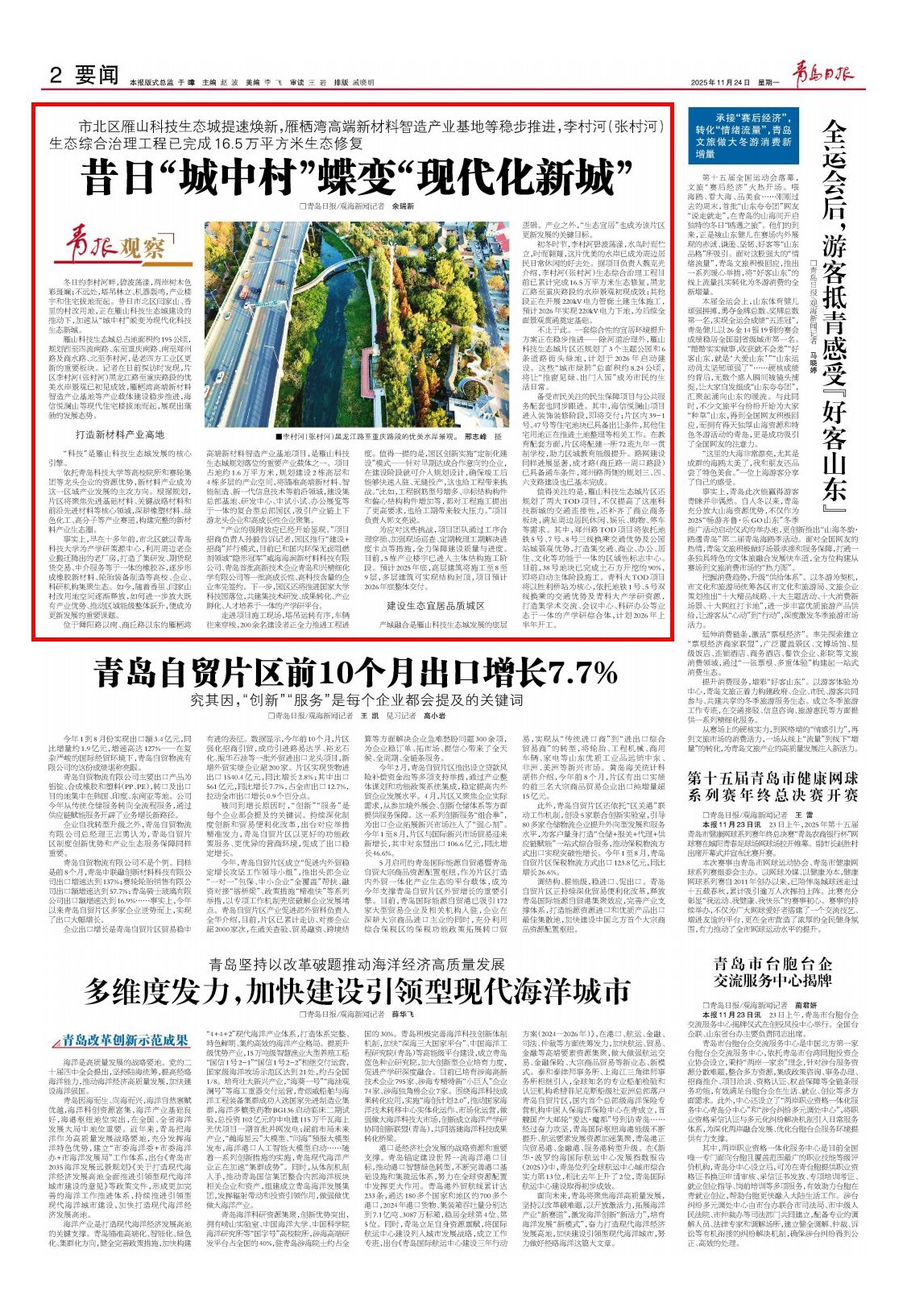 市北区雁山科技生态城提速焕新,雁栖湾高端新材料智造产业基地等稳步推进,李村河(张村河)生态综合治理工程已完成16.5万平方米生态修复