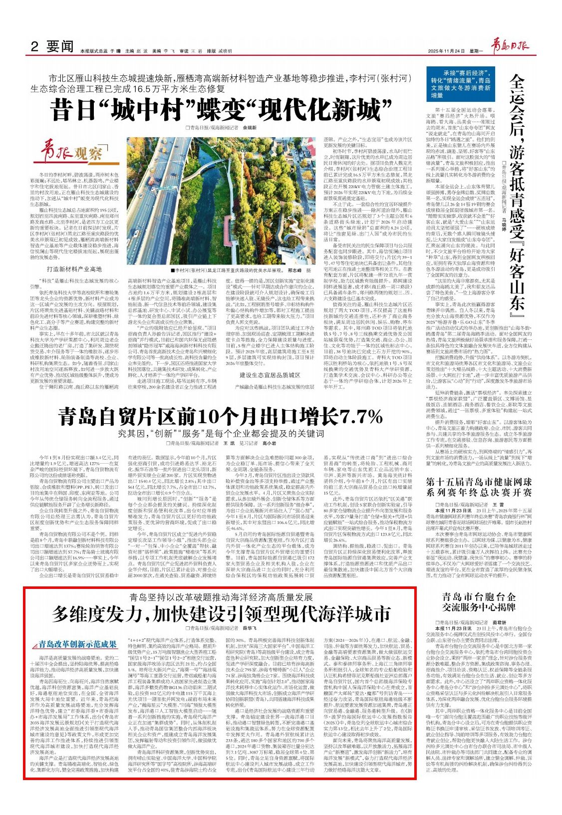 面向未来,青岛将聚焦海洋高质量发展,坚持以改革破难题,以开放激活力,拓展海洋产业“新赛道”,激发海洋创新“新活力”,培育海洋发展“新模式”,奋力打造现代海洋经济发展高地,加快建设引领型现代海洋城市,努力做好经略海洋这篇大文章。(青岛日报/观海新闻记者 薛华飞)