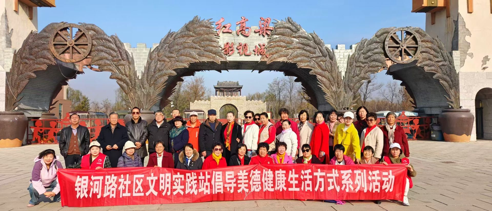 随后在红高粱影视基地,一行人参观单家大院、十八里坡民俗村等实景场地,沉浸式感受红高粱精神中的家国情怀。中午,活动安排了特色聚餐,居民们在轻松氛围中交流互动,进一步拉近彼此距离,充分彰显社区和谐氛围。