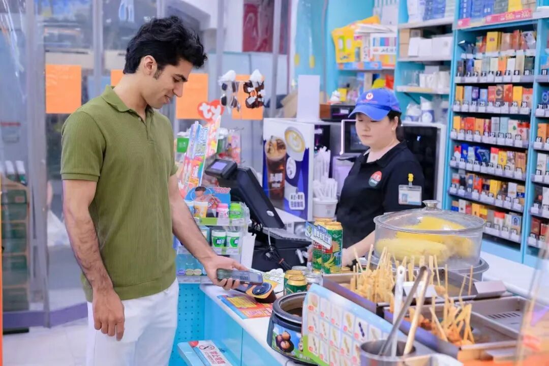 外籍友人在青岛一便利店使用“碰一下支付”。